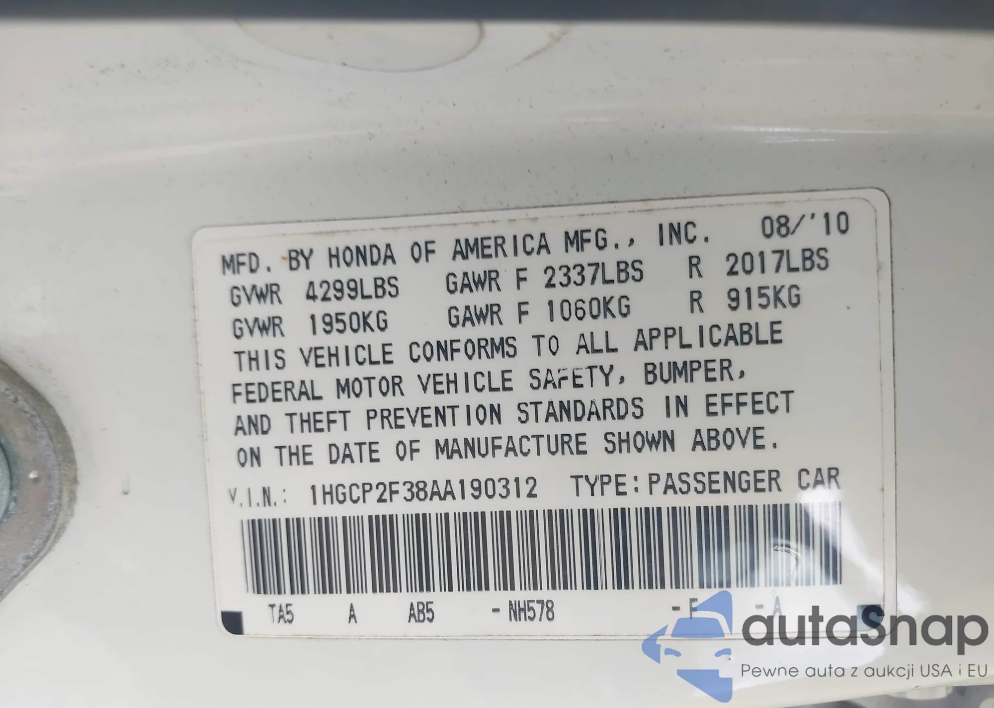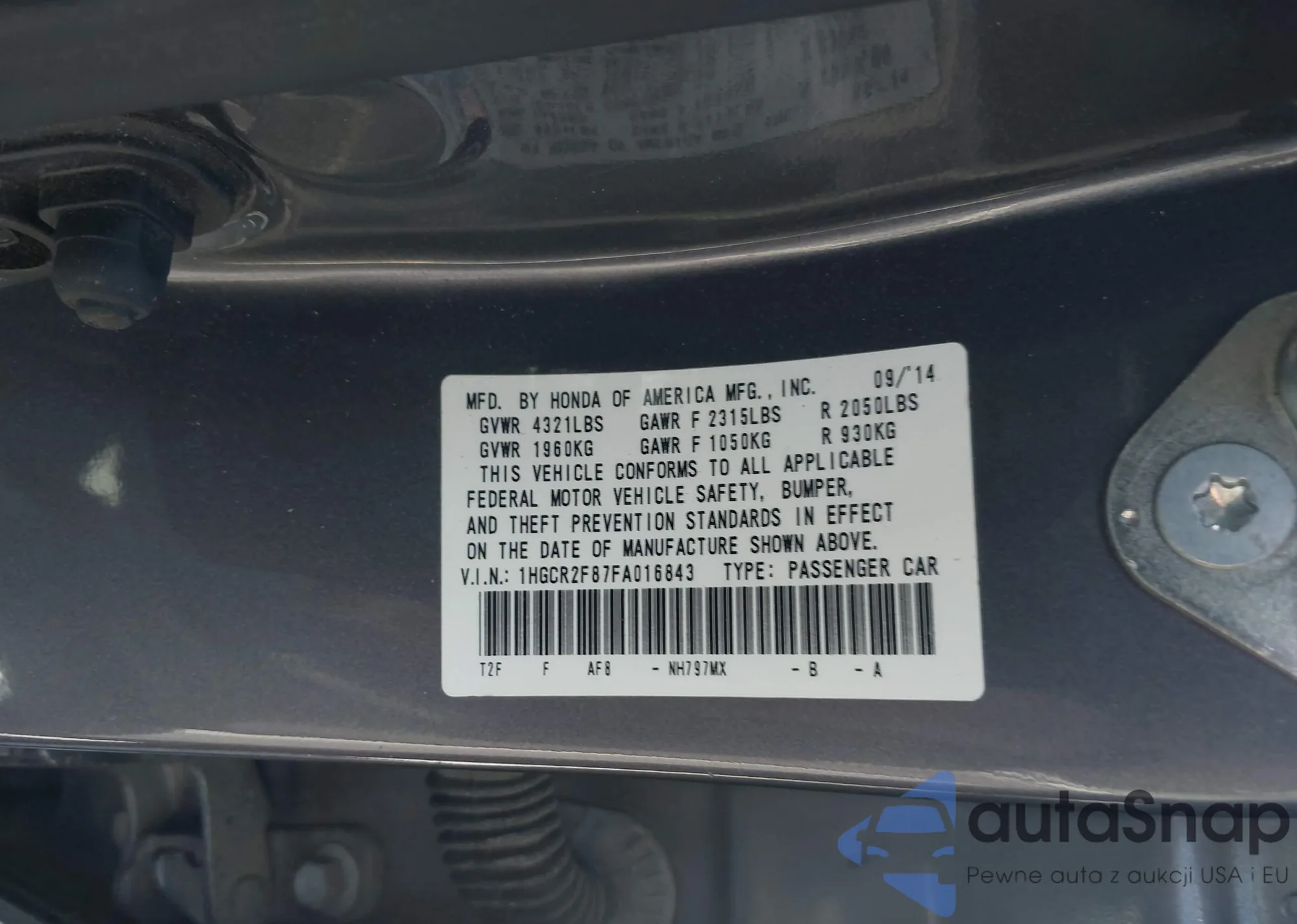 LOT: 42065833 VIN: 1HGCR2F87FA016843