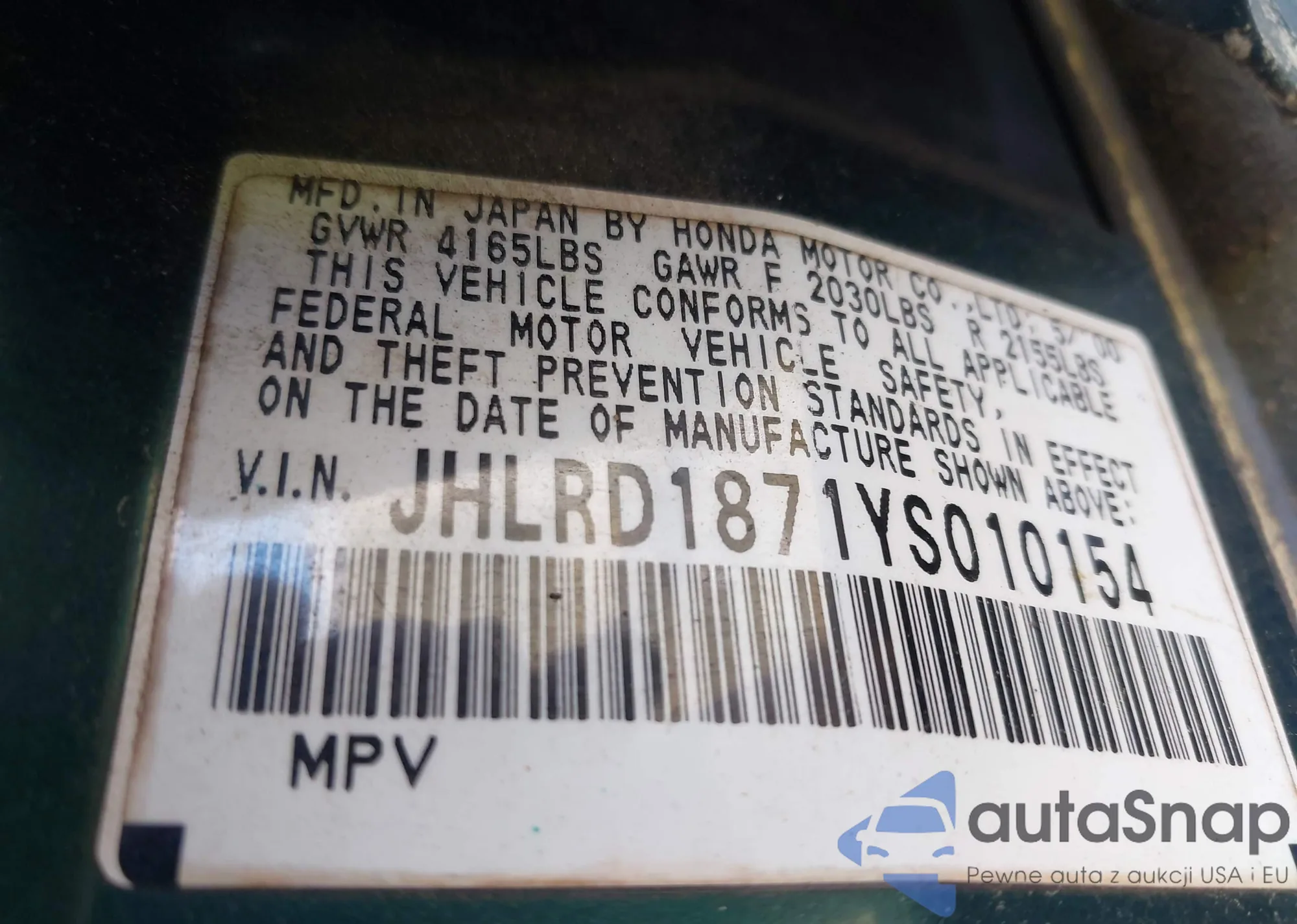 • VIN JHLRD1871YS010154