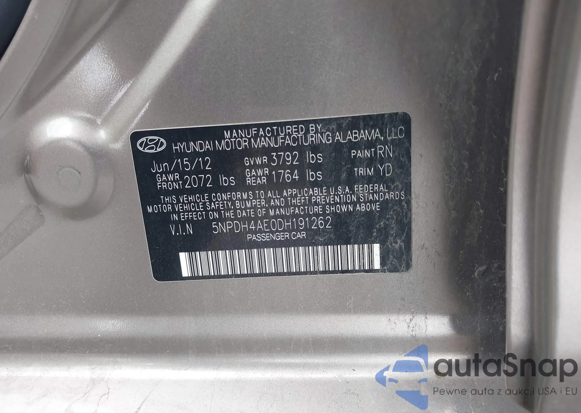 • VIN 5NPDH4AE0DH191262