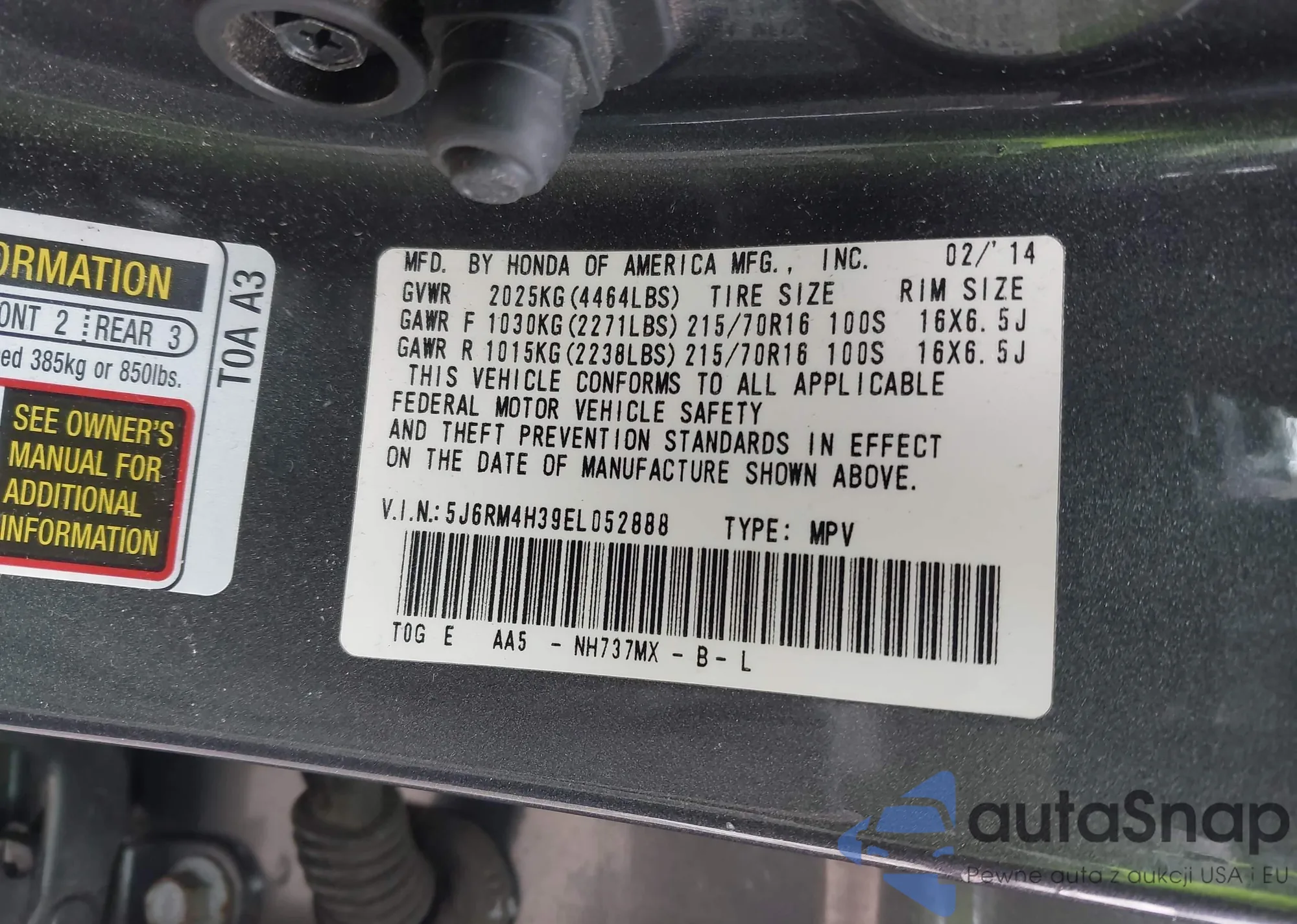 • VIN 5J6RM4H39EL052888