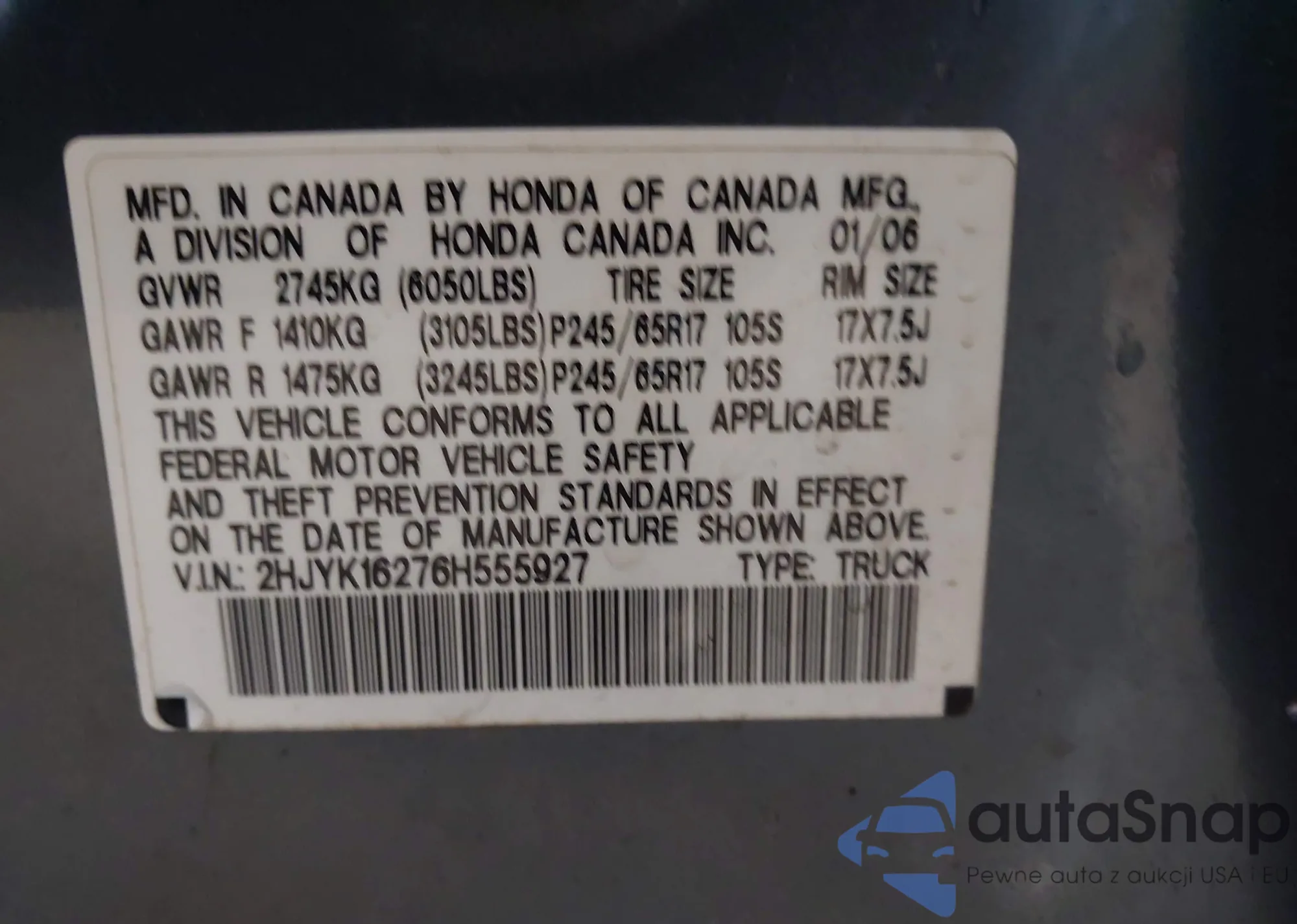 • VIN 2HJYK16276H555927