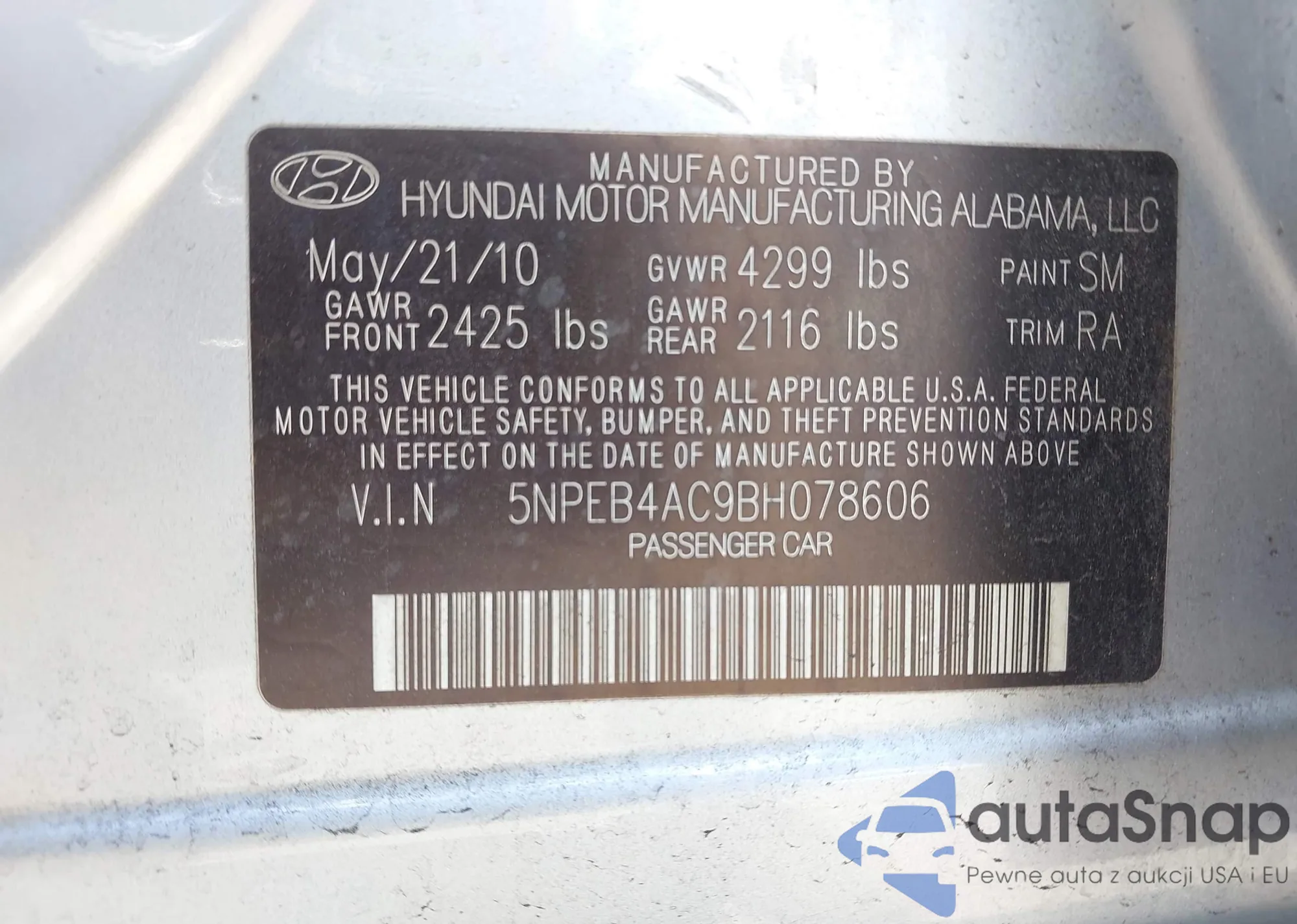 • VIN 5NPEB4AC9BH078606
