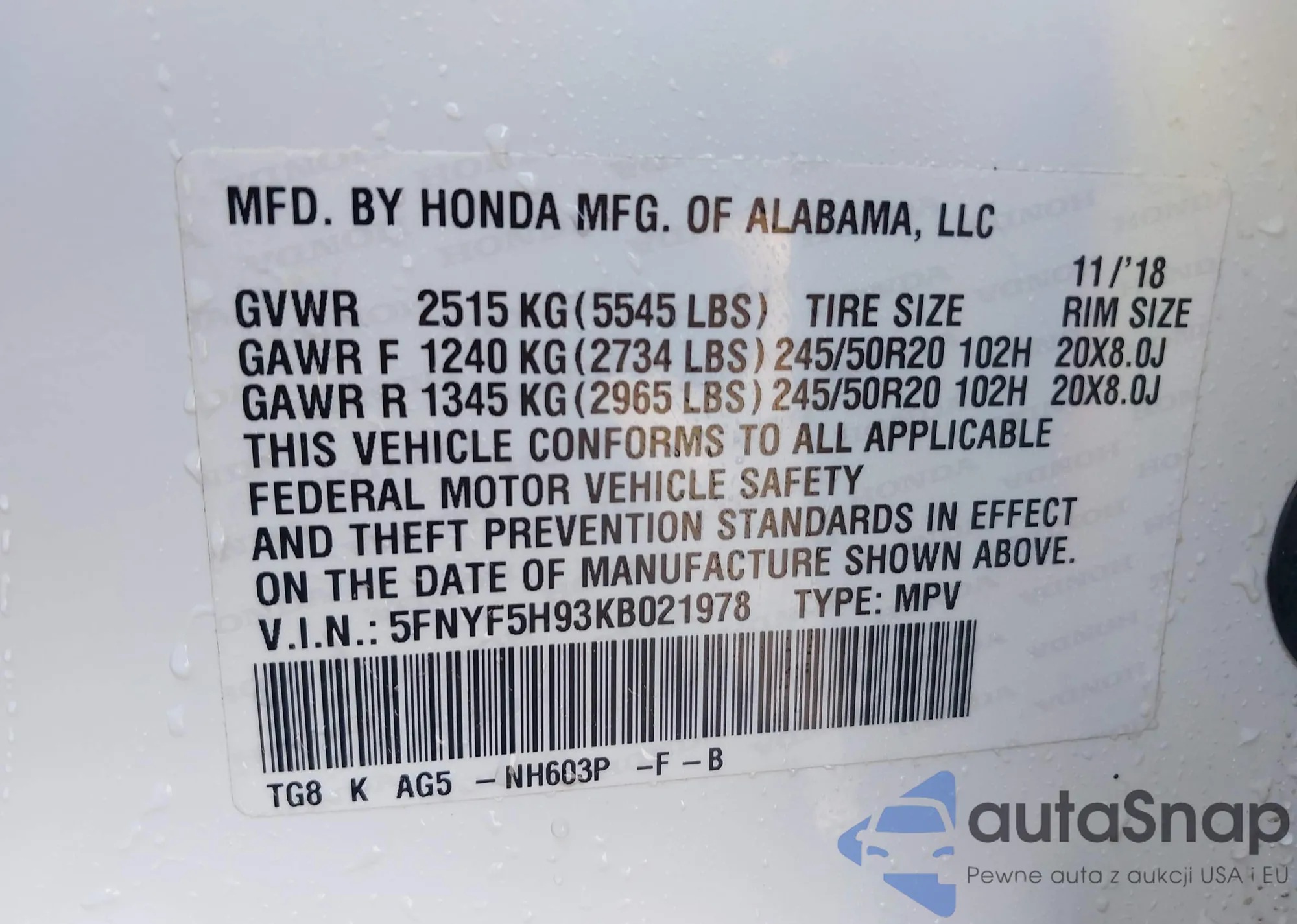 • VIN 5FNYF5H93KB021978