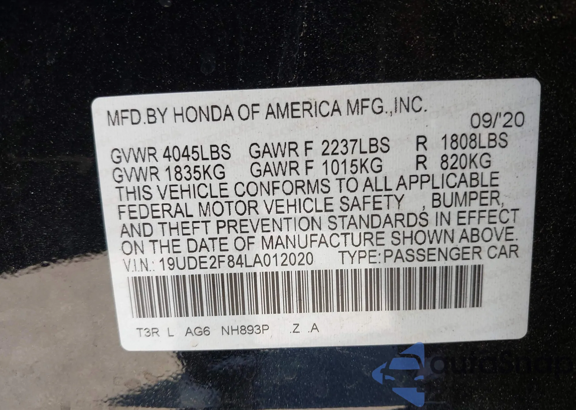 LOT: 42155806 VIN: 19UDE2F84LA012020