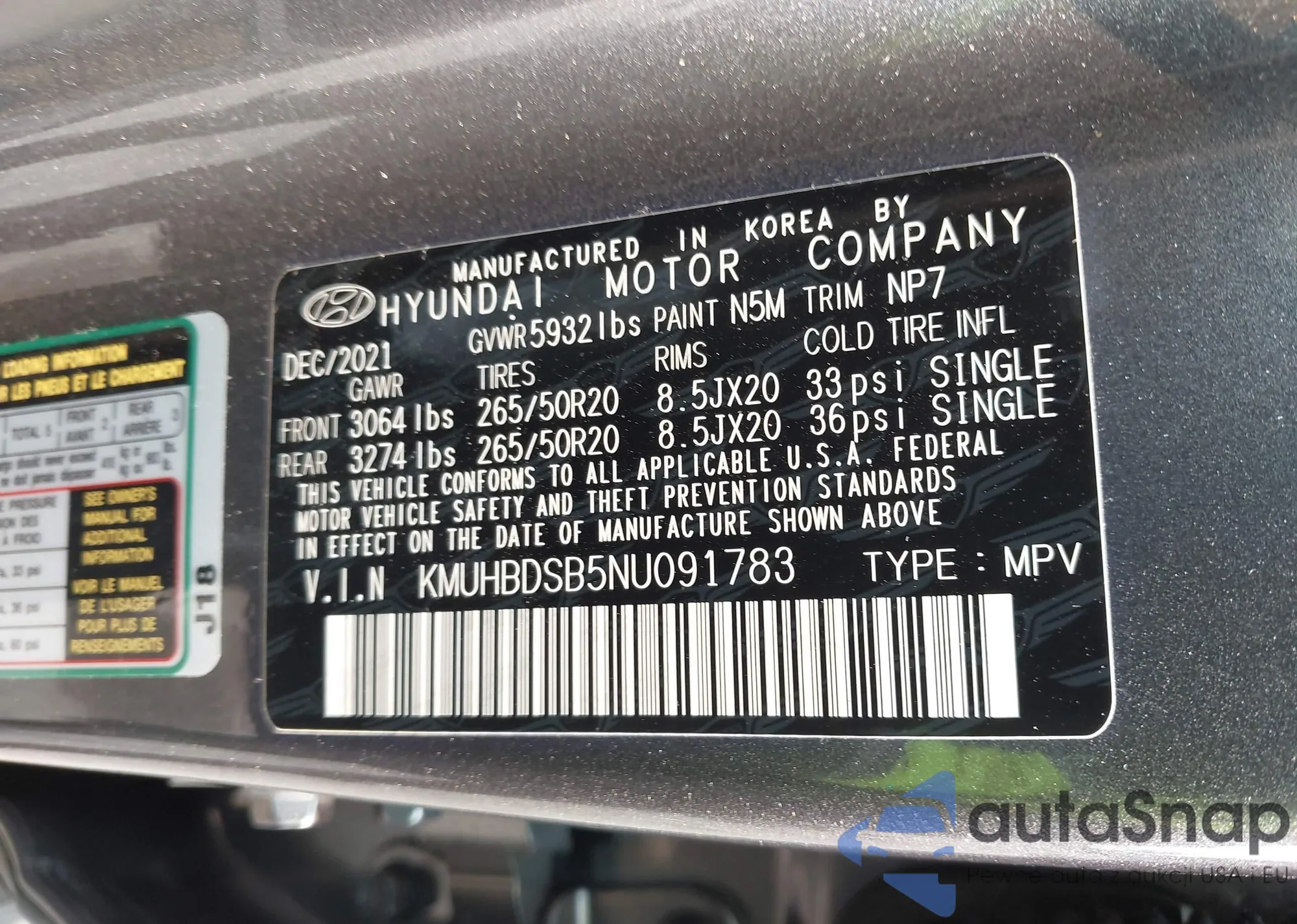 LOT: 42324573 VIN: KMUHBDSB5NU091783