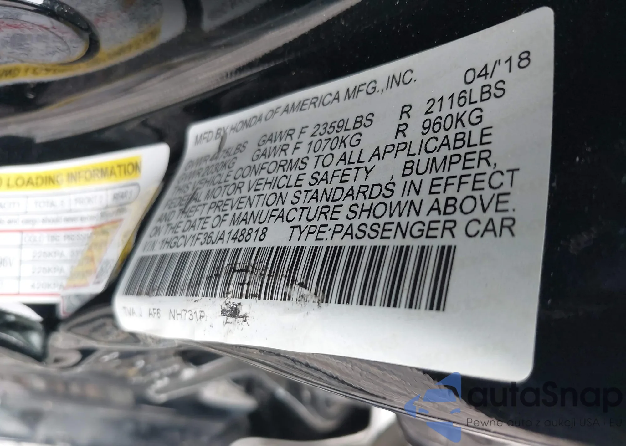 LOT: 42352660 VIN: 1HGCV1F36JA148818