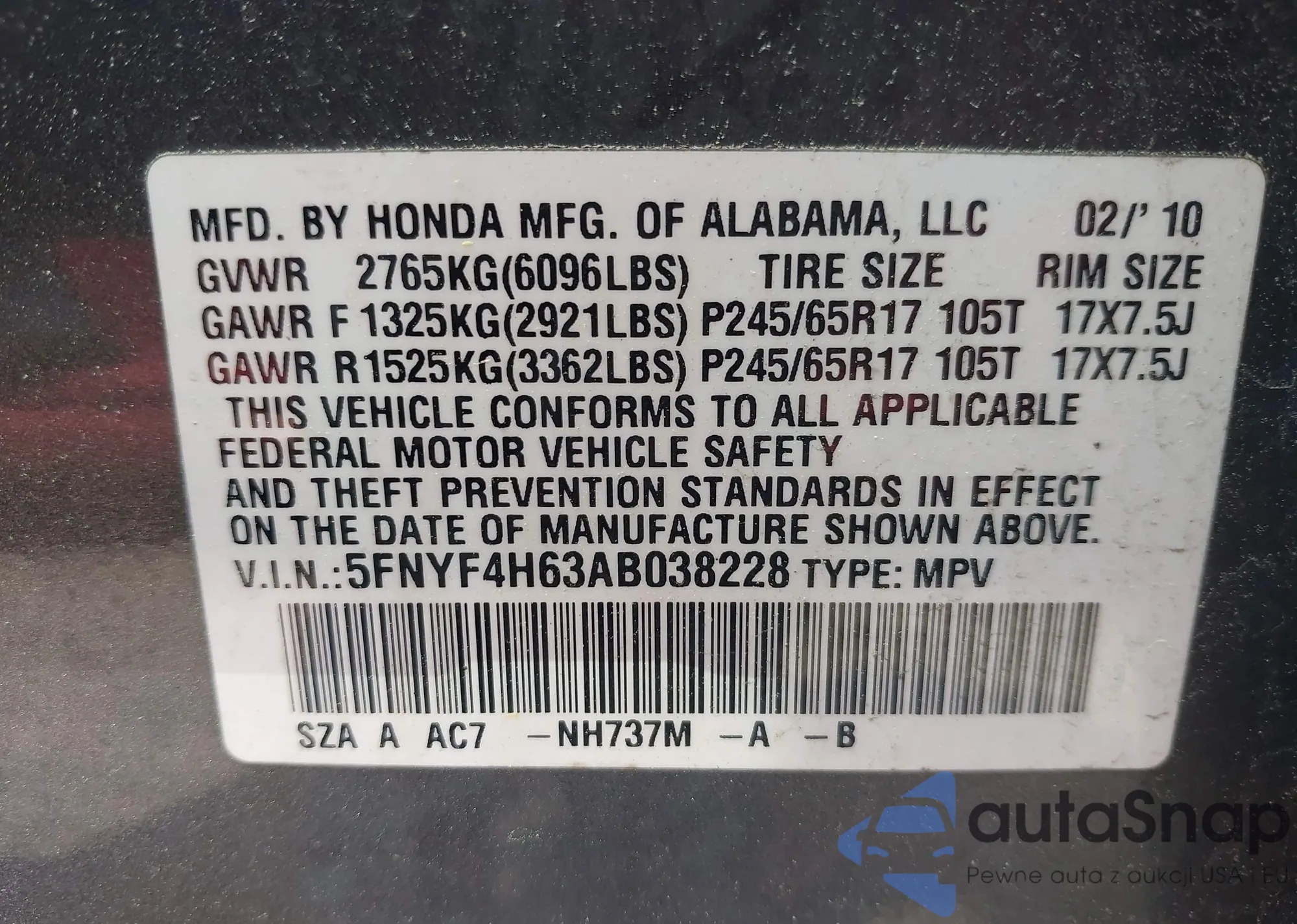 LOT: 42477484 VIN: 5FNYF4H63AB038228