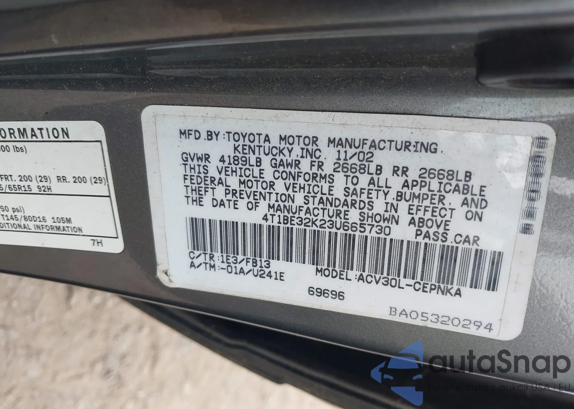 LOT: 42522296 VIN: 4T1BE32K23U665730