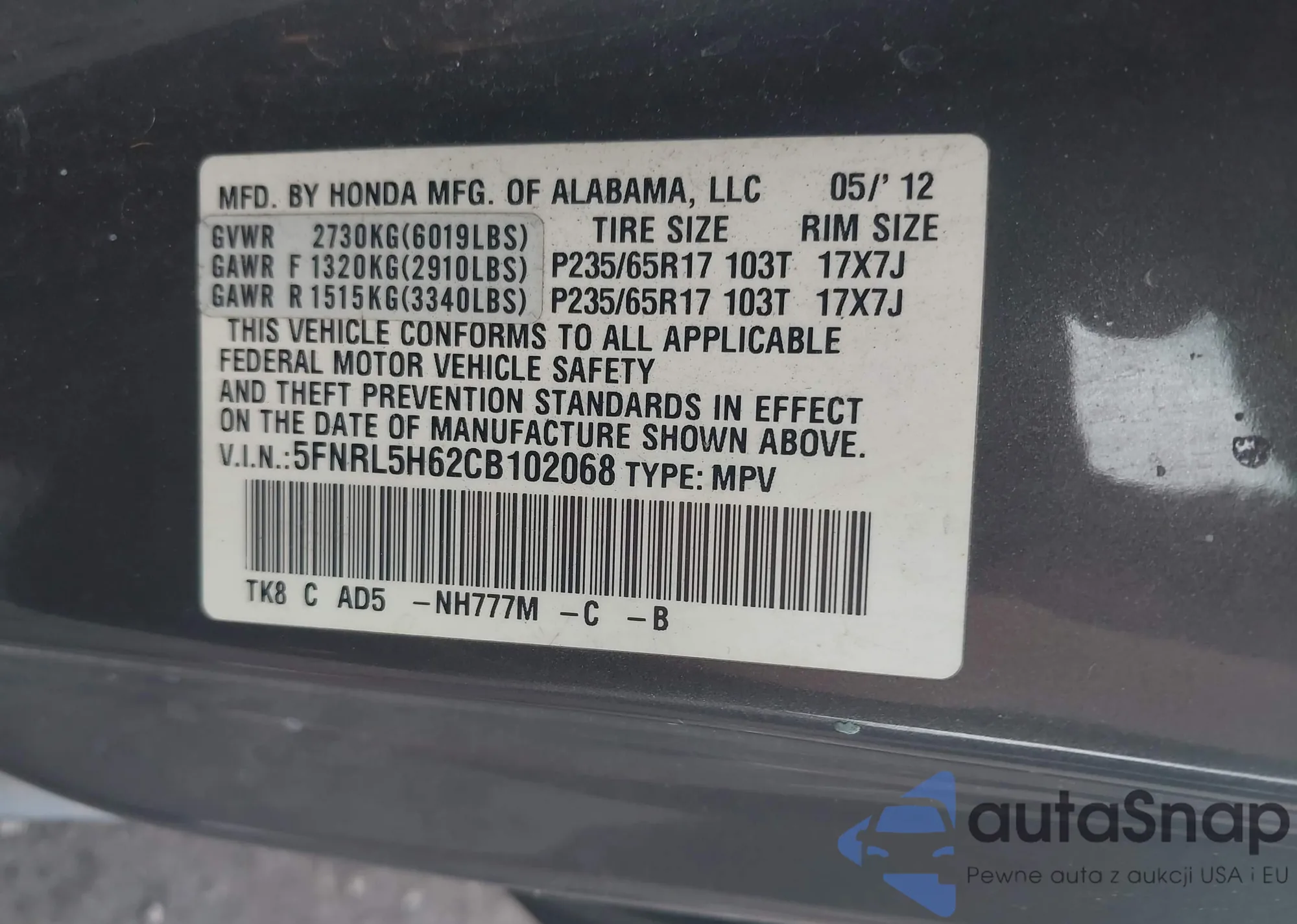 • VIN 5FNRL5H62CB102068