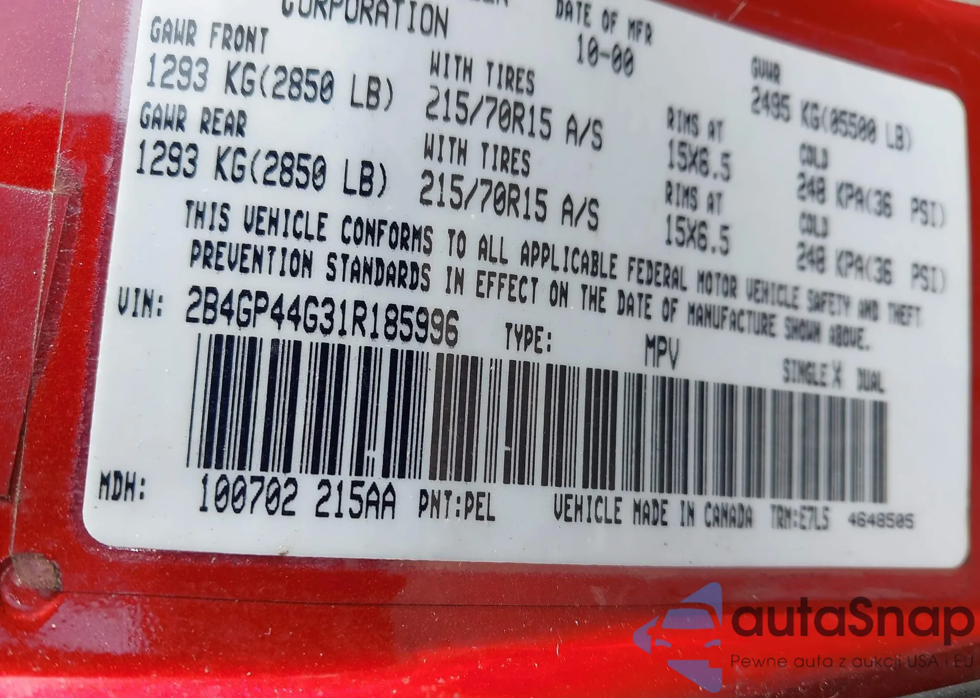 • VIN 2B4GP44G31R185996