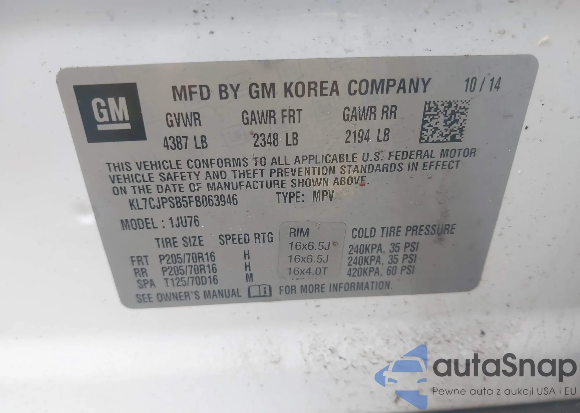 LOT: 42419044 VIN: KL7CJPSB5FB063946