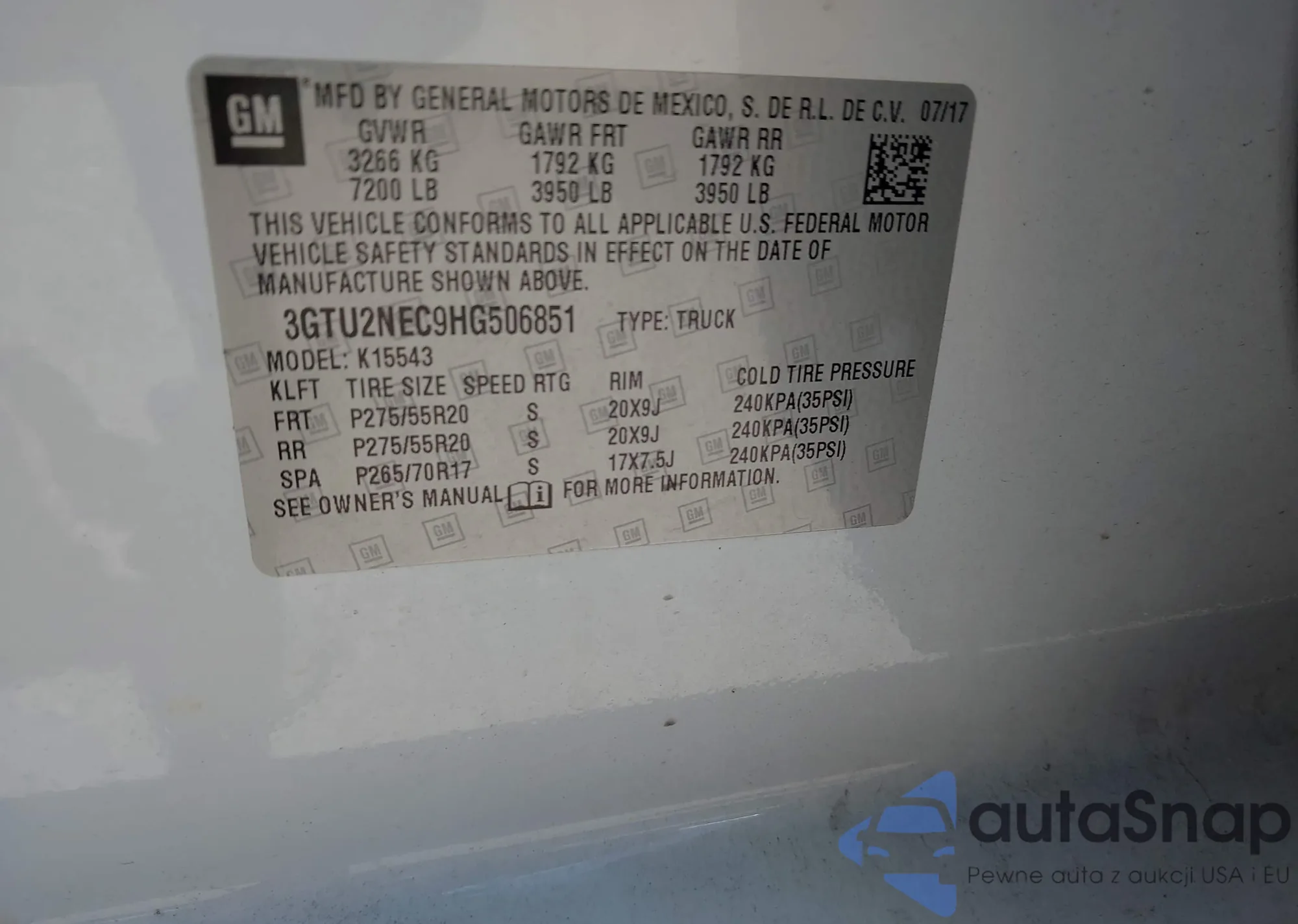 LOT: 42160982 VIN: 3GTU2NEC9HG506851