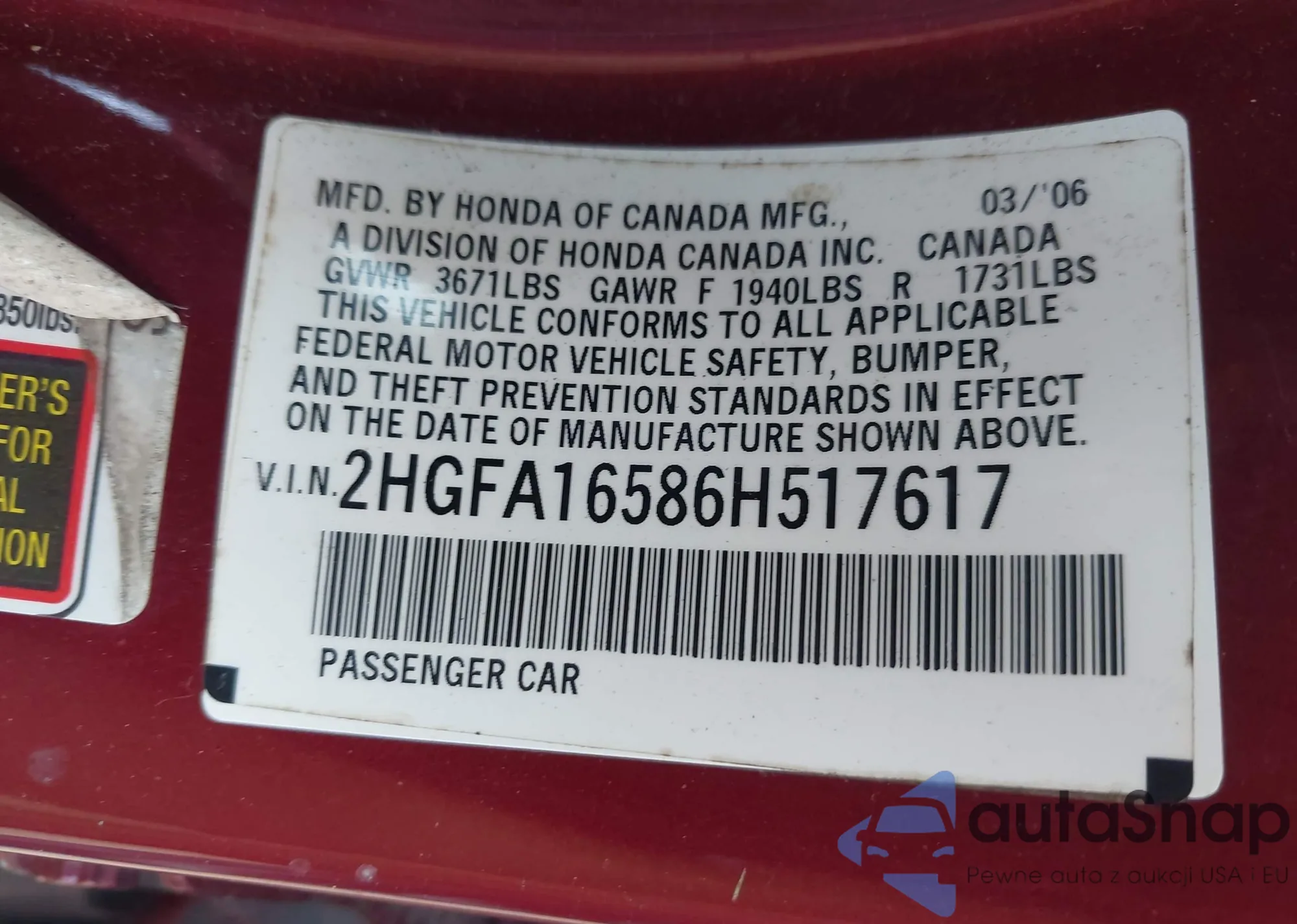 LOT: 42360117 VIN: 2HGFA16586H517617
