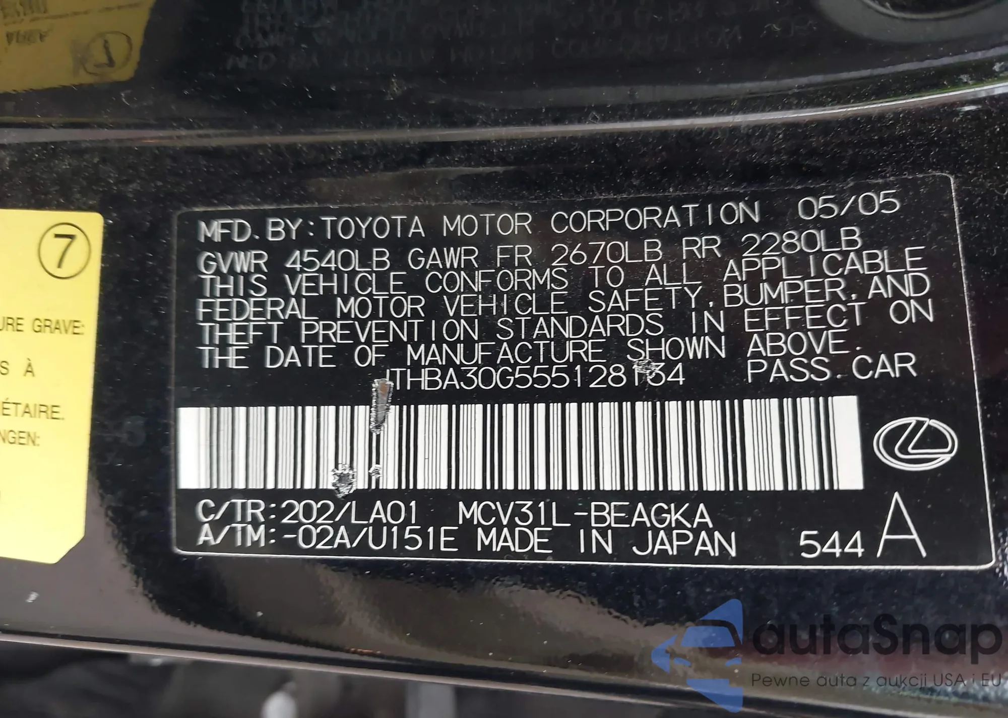 LOT: 42368102 VIN: JTHBA30G555128134