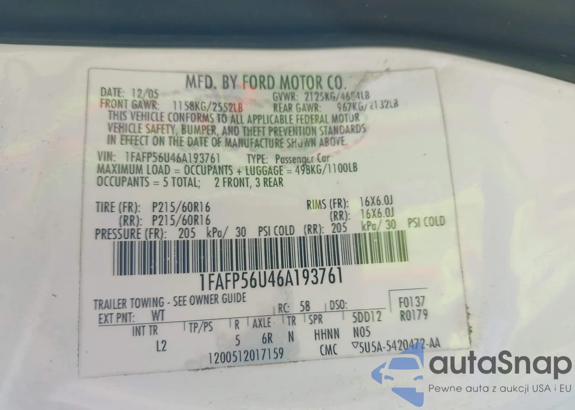 LOT: 42427063 VIN: 1FAFP56U46A193761