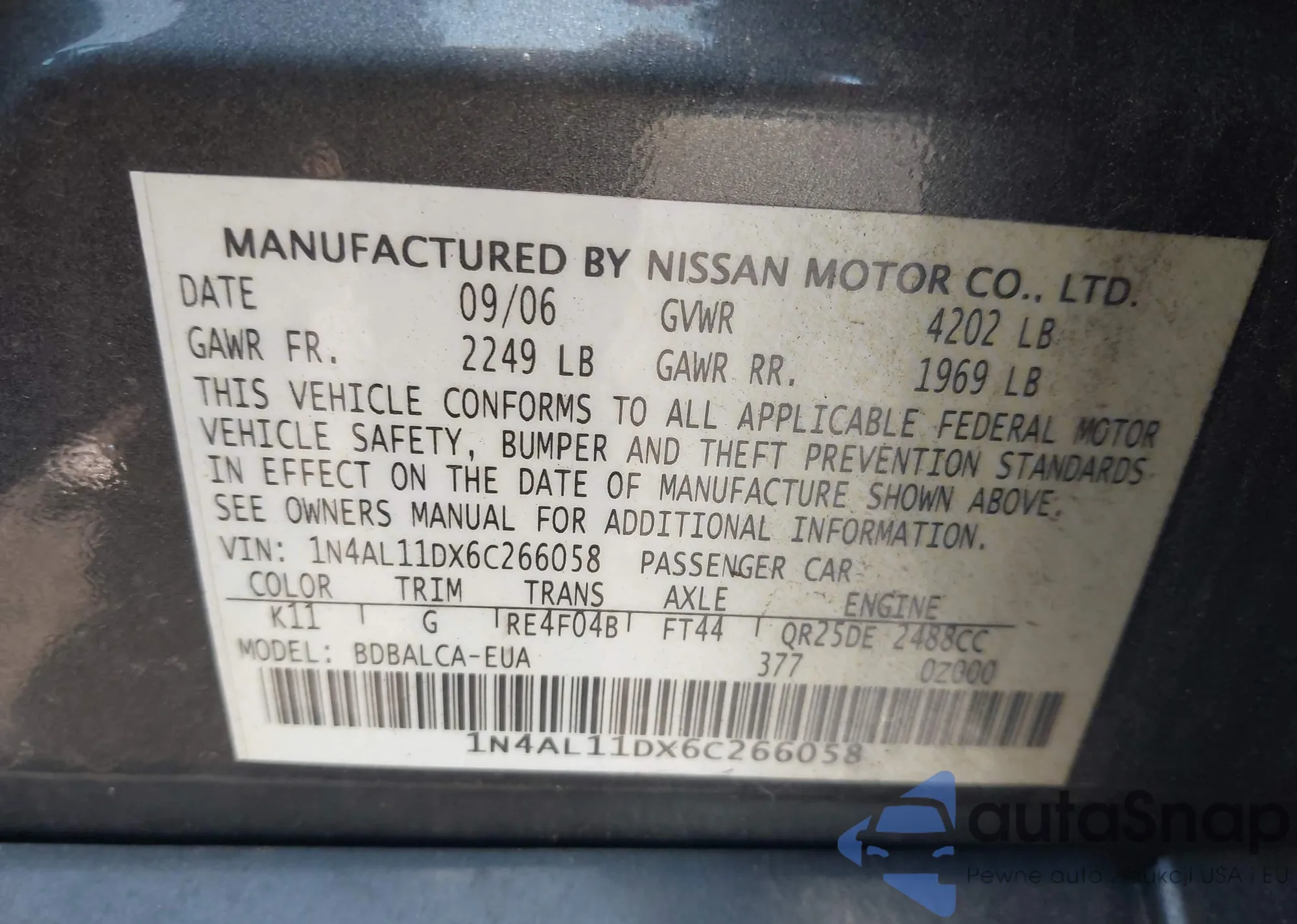 • VIN 1N4AL11DX6C266058