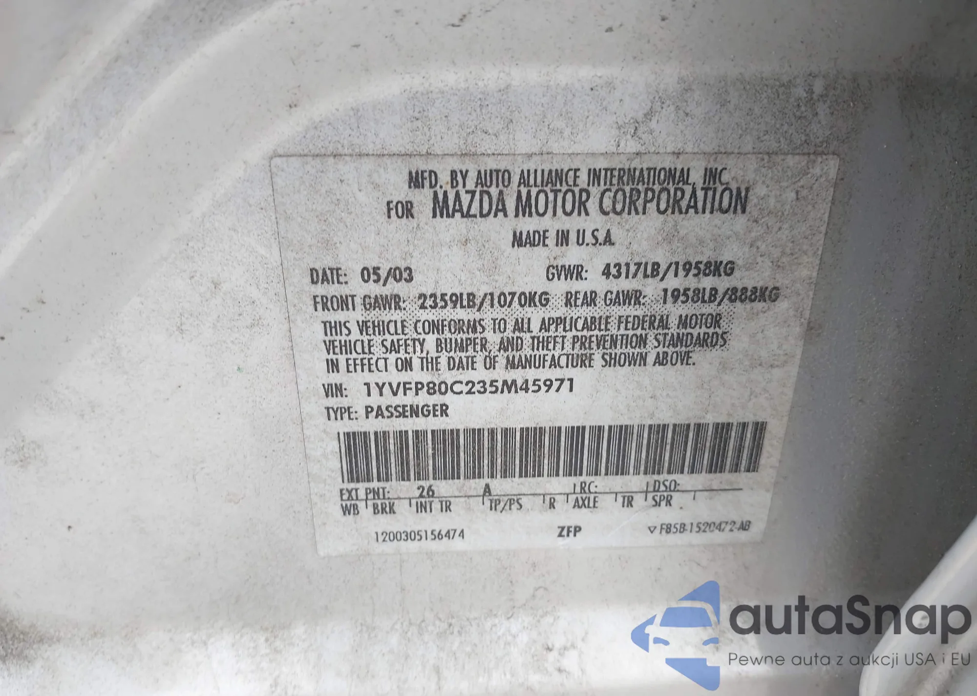 2003 Mazda Mazda6 I из США, поврежденный, VIN 1YVFP80C235M45971