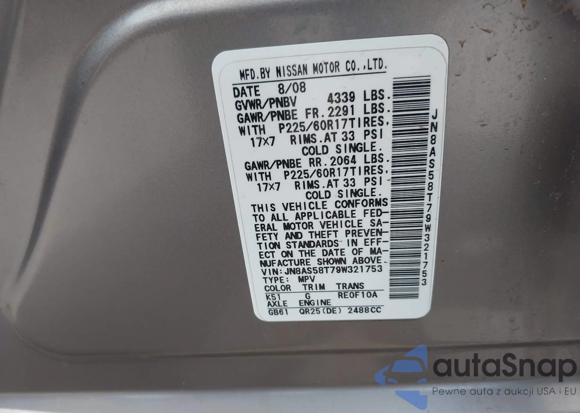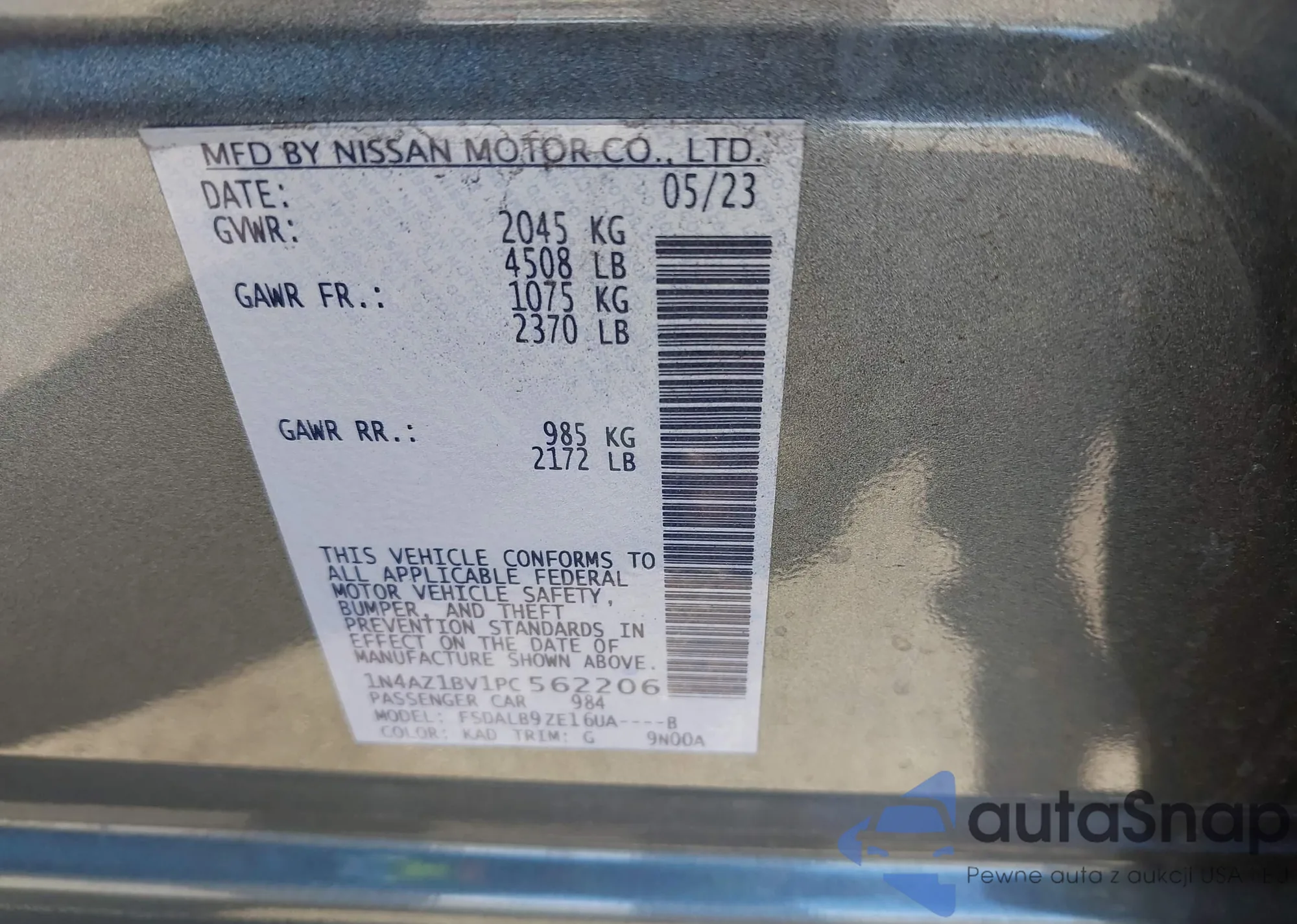 • VIN 1N4AZ1BV1PC562206