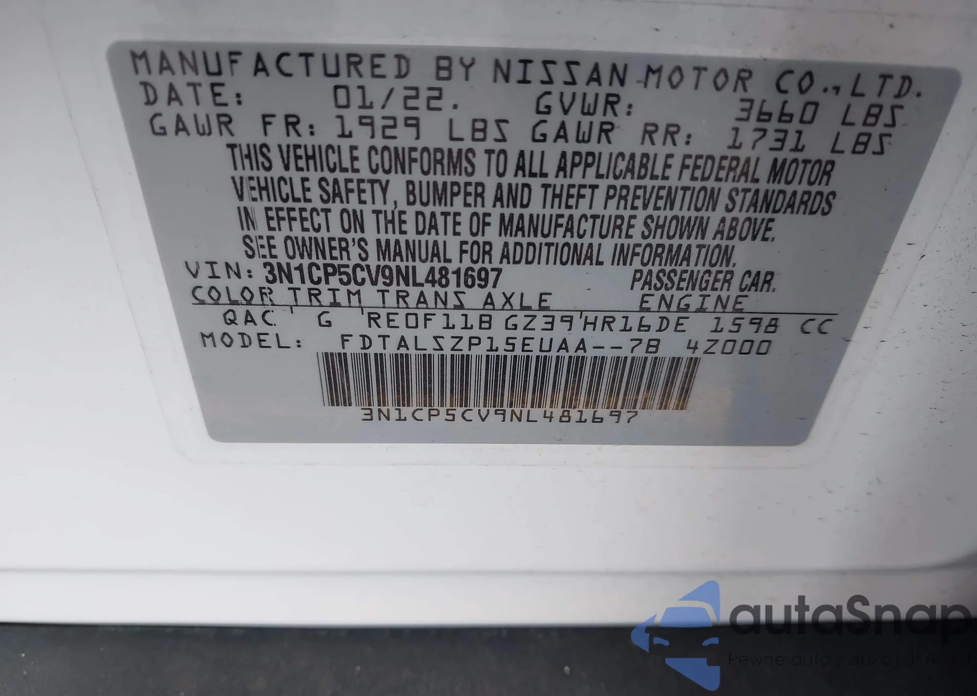 • VIN 3N1CP5CV9NL481697