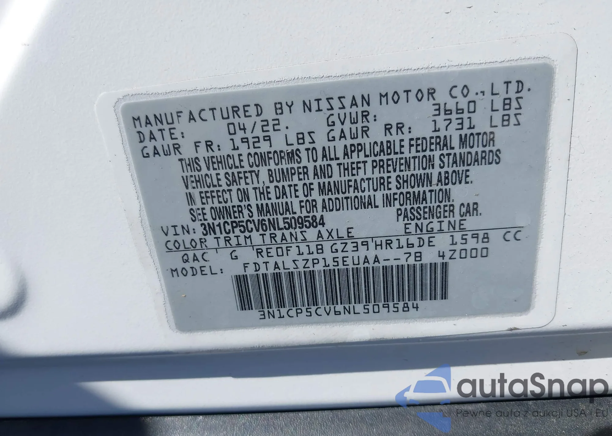 LOT: 41830068 VIN: 3N1CP5CV6NL509584