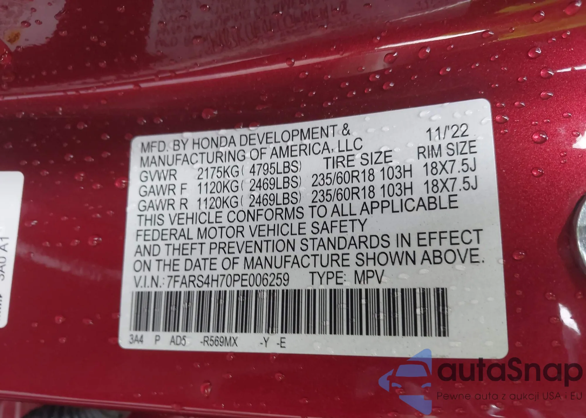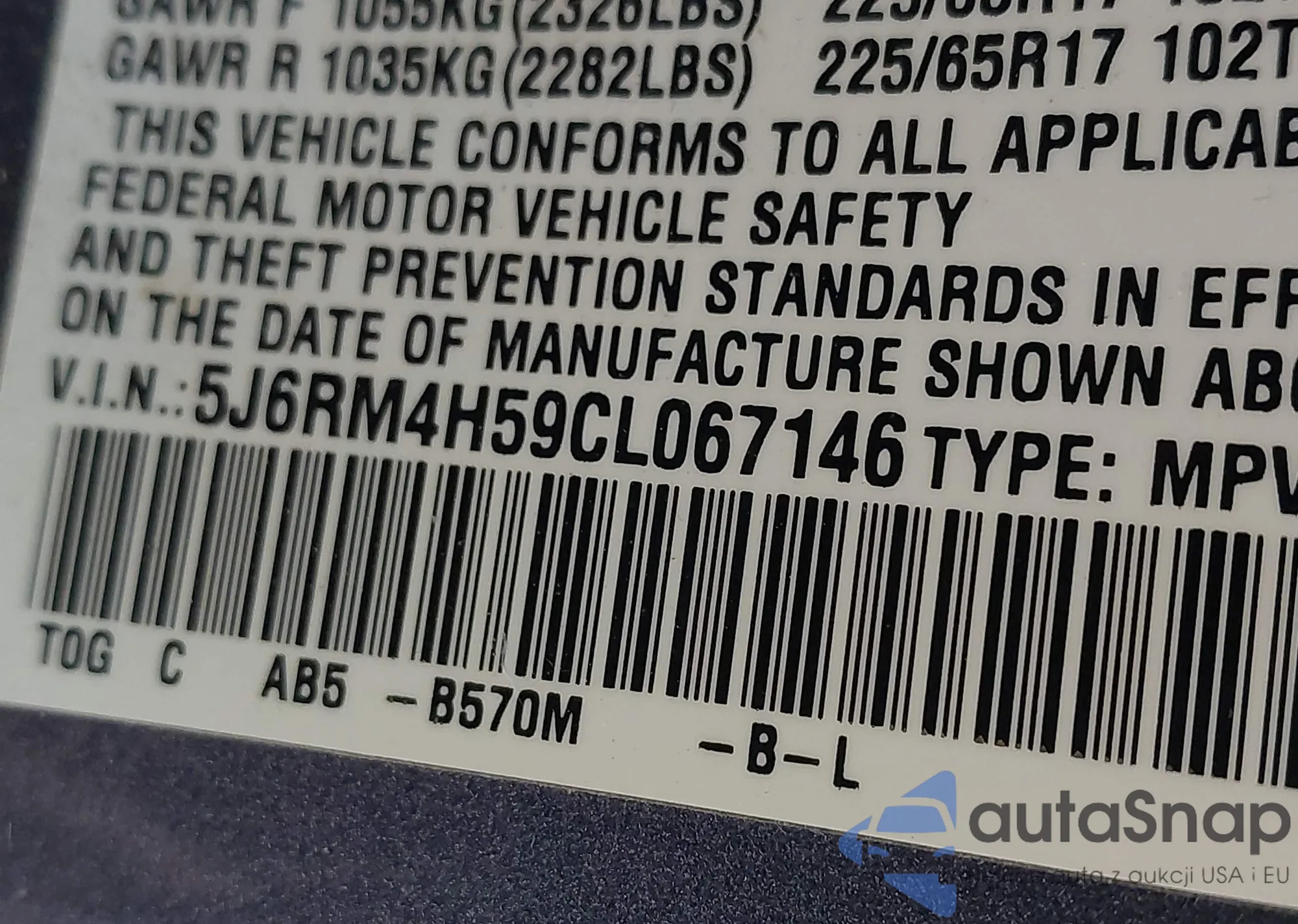 • VIN 5J6RM4H59CL067146