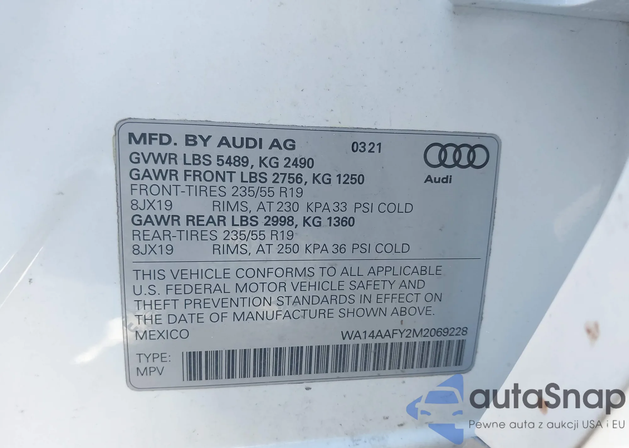 LOT: 41930892 VIN: WA14AAFY2M2069228