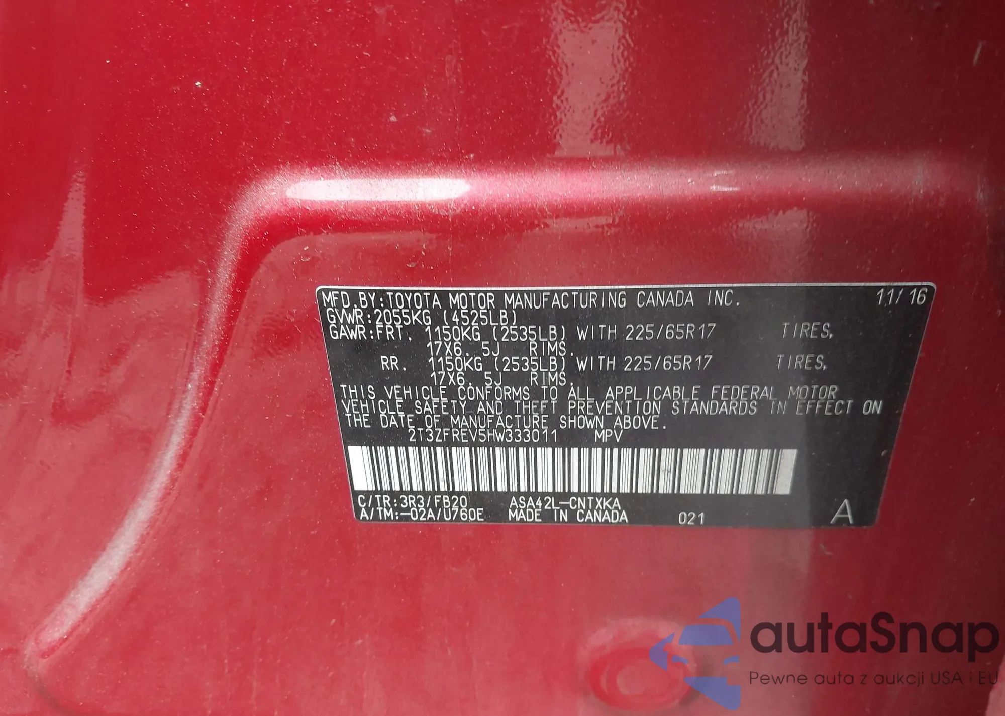• VIN 2T3ZFREV5HW333011