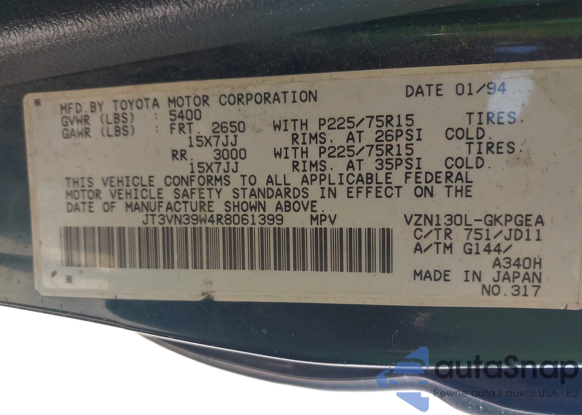 LOT: 42455341 VIN: JT3VN39W4R8061399