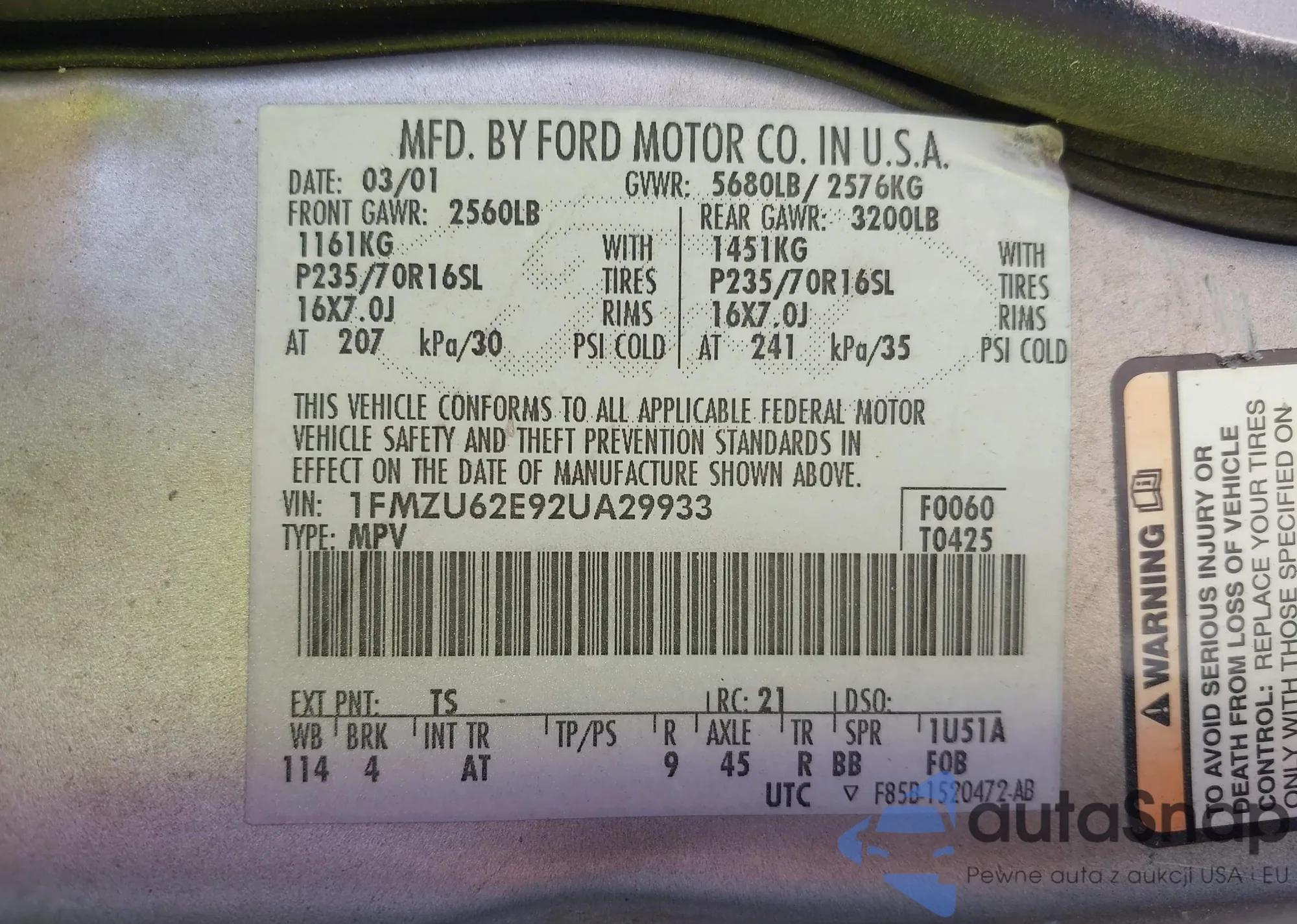 • VIN 1FMZU62E92UA29933