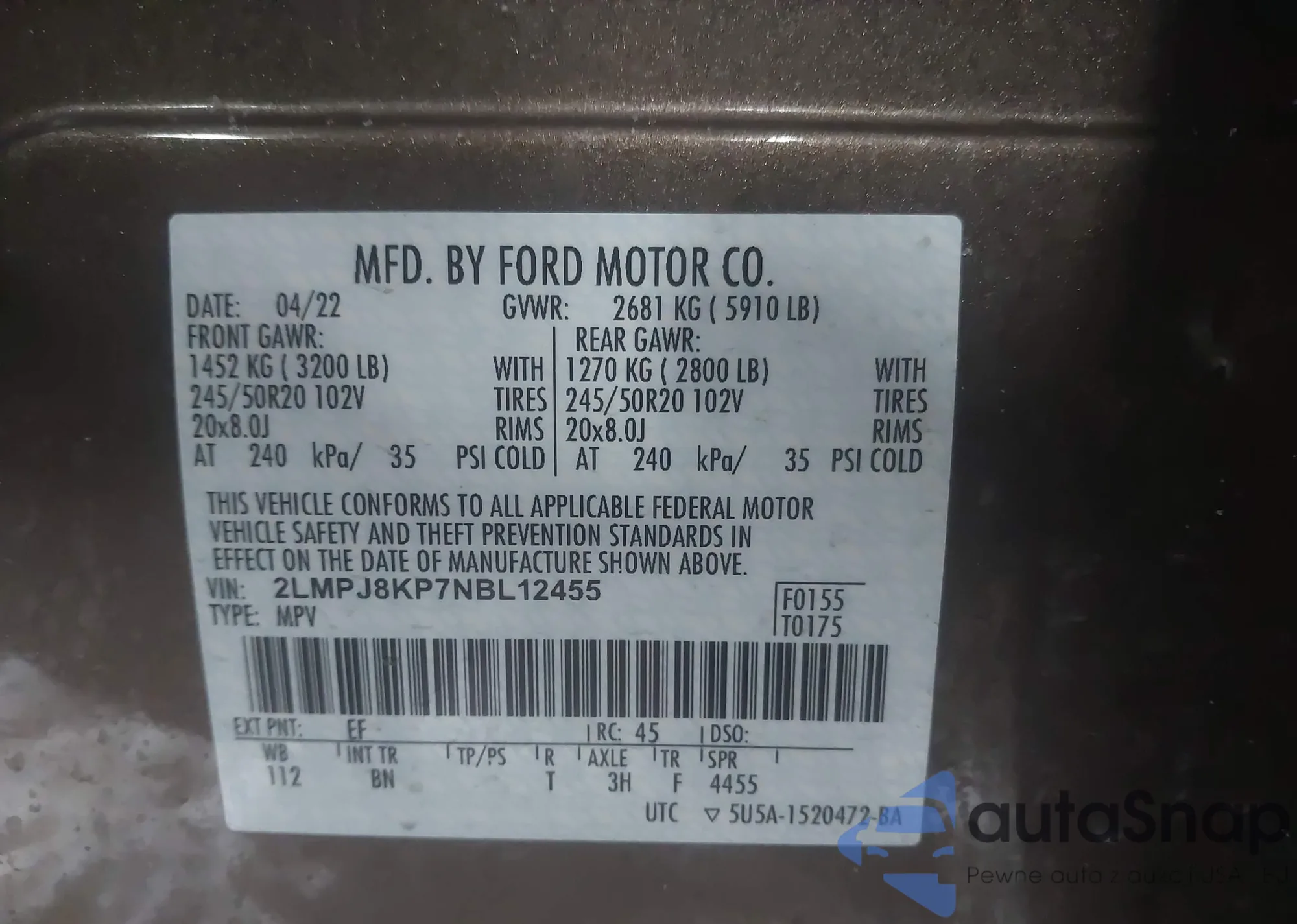 LOT: 41617225 VIN: 2LMPJ8KP7NBL12455