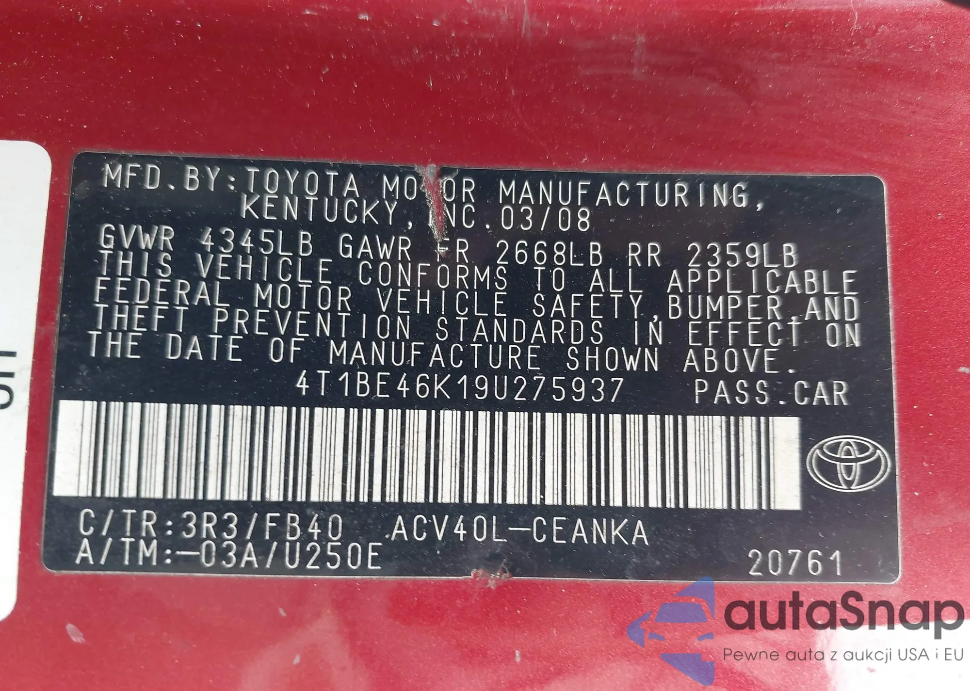 • VIN 4T1BE46K19U275937
