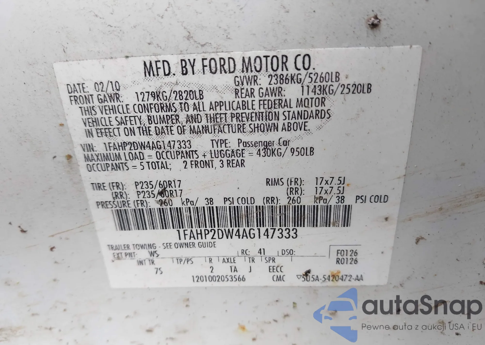 LOT: 42218183 VIN: 1FAHP2DW4AG147333