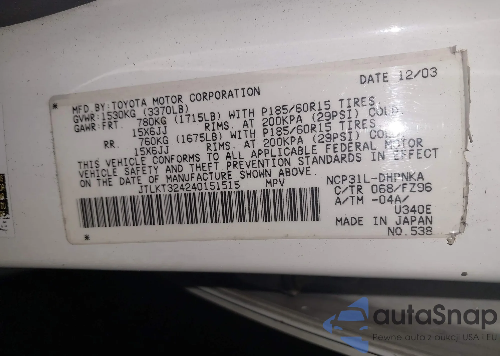 LOT: 42230865 VIN: JTLKT324240151515