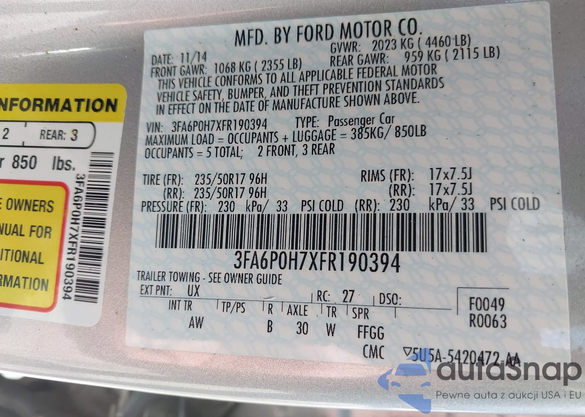 LOT: 42453883 VIN: 3FA6P0H7XFR190394