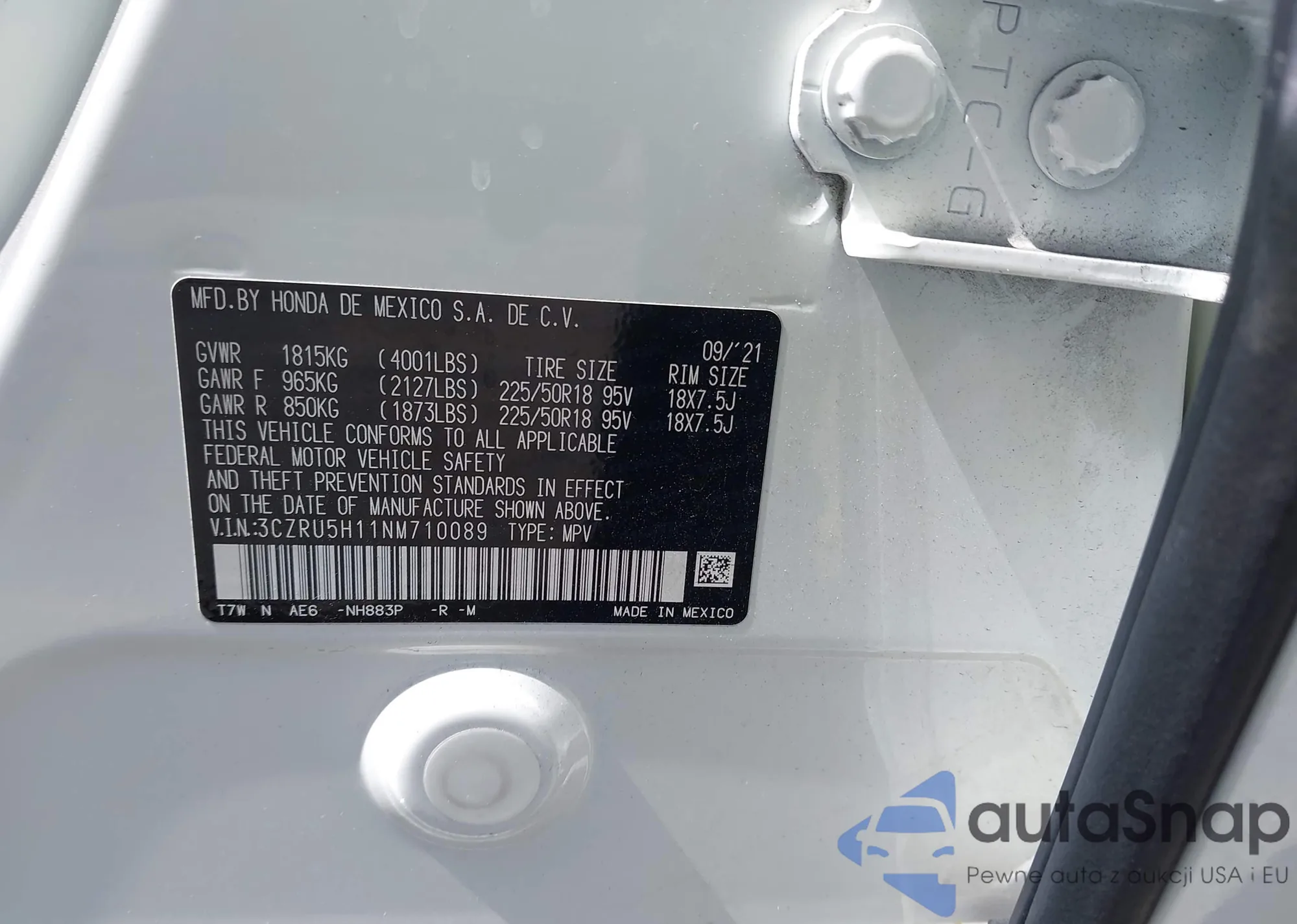• VIN 3CZRU5H11NM710089