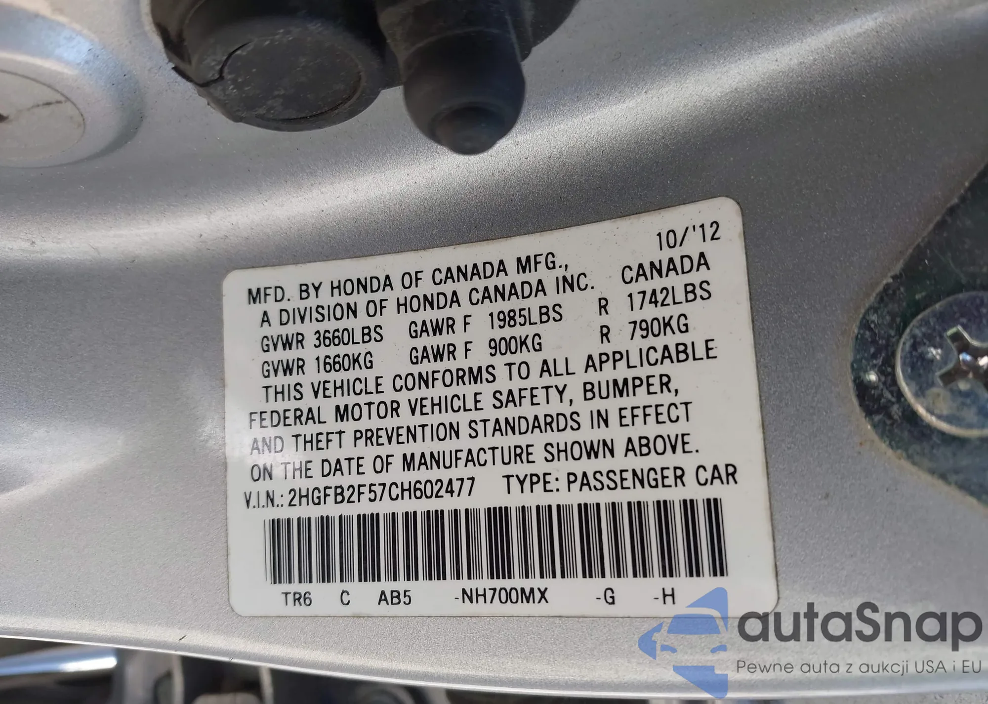 • VIN 2HGFB2F57CH602477