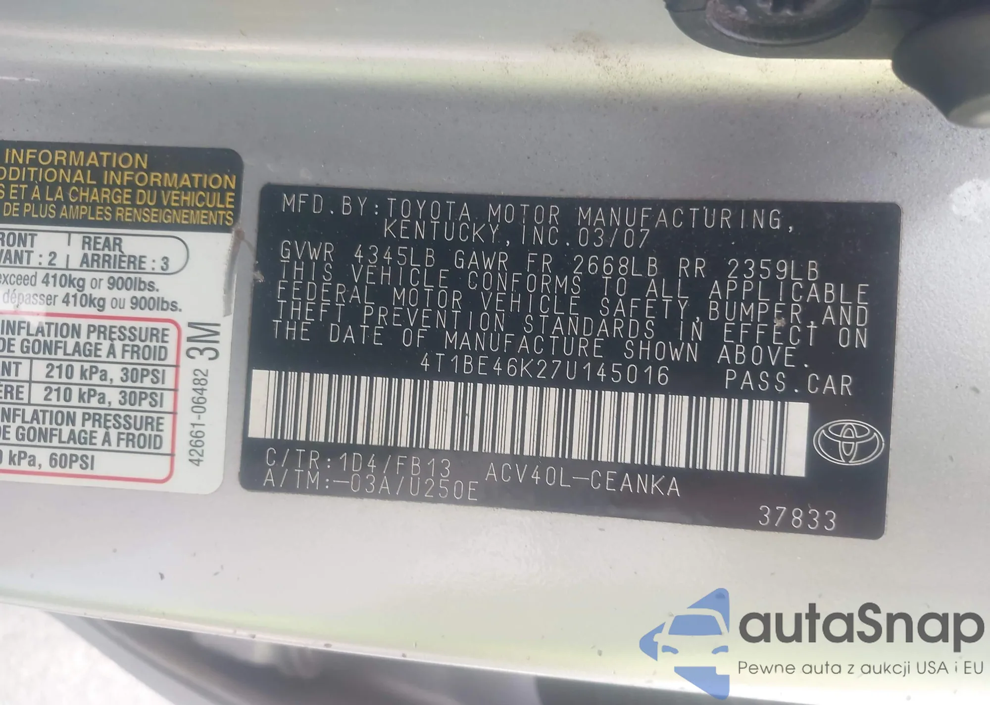 LOT: 42412904 VIN: 4T1BE46K27U145016