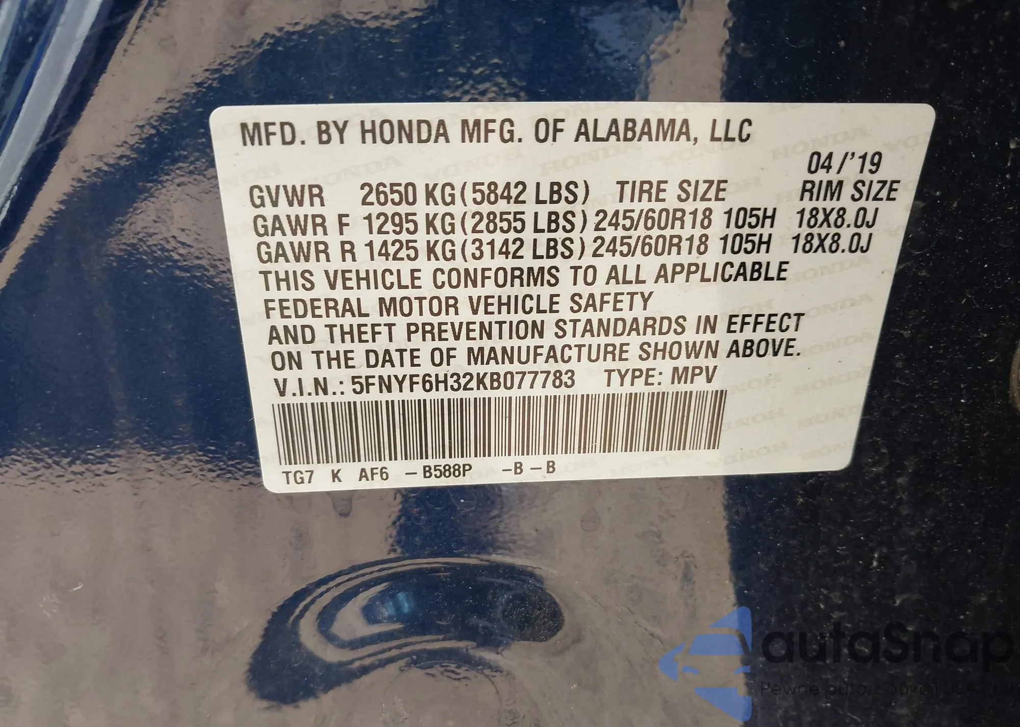 LOT: 42202122 VIN: 5FNYF6H32KB077783