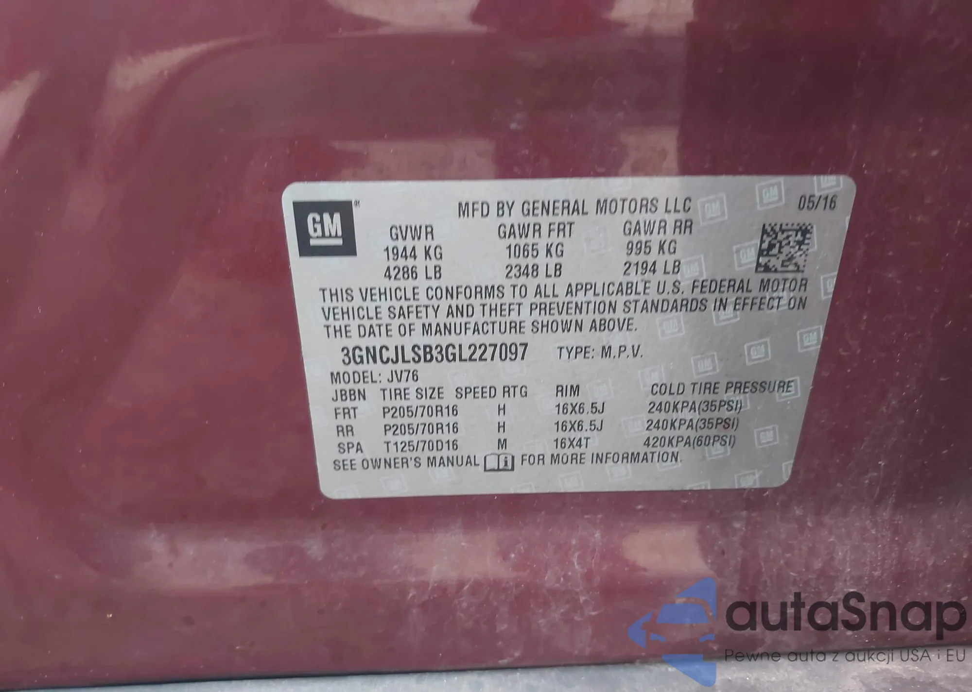 • VIN 3GNCJLSB3GL227097