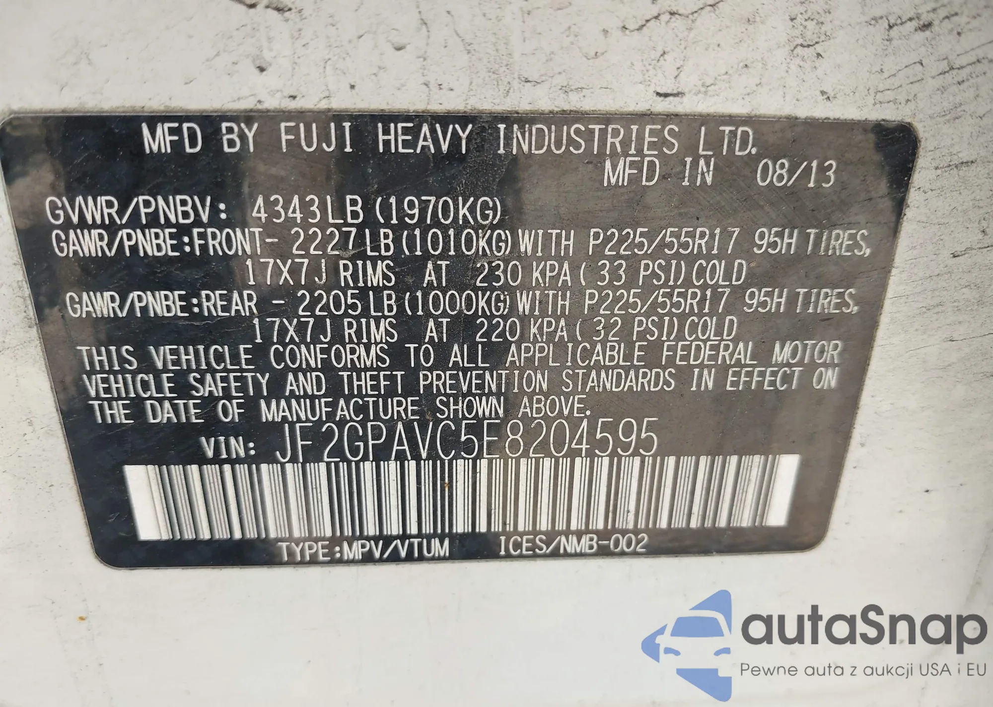 LOT: 42310962 VIN: JF2GPAVC5E8204595