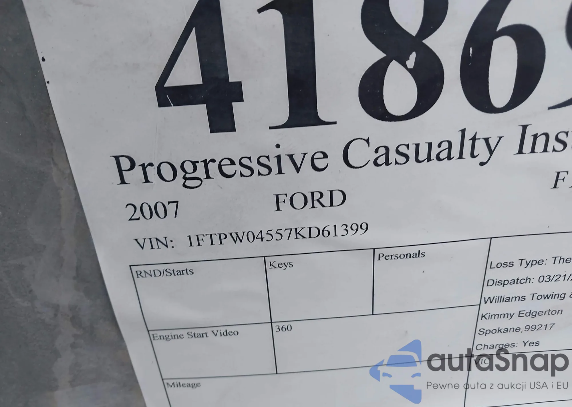 LOT: 41869183 VIN: 1FTPW04557KD61399