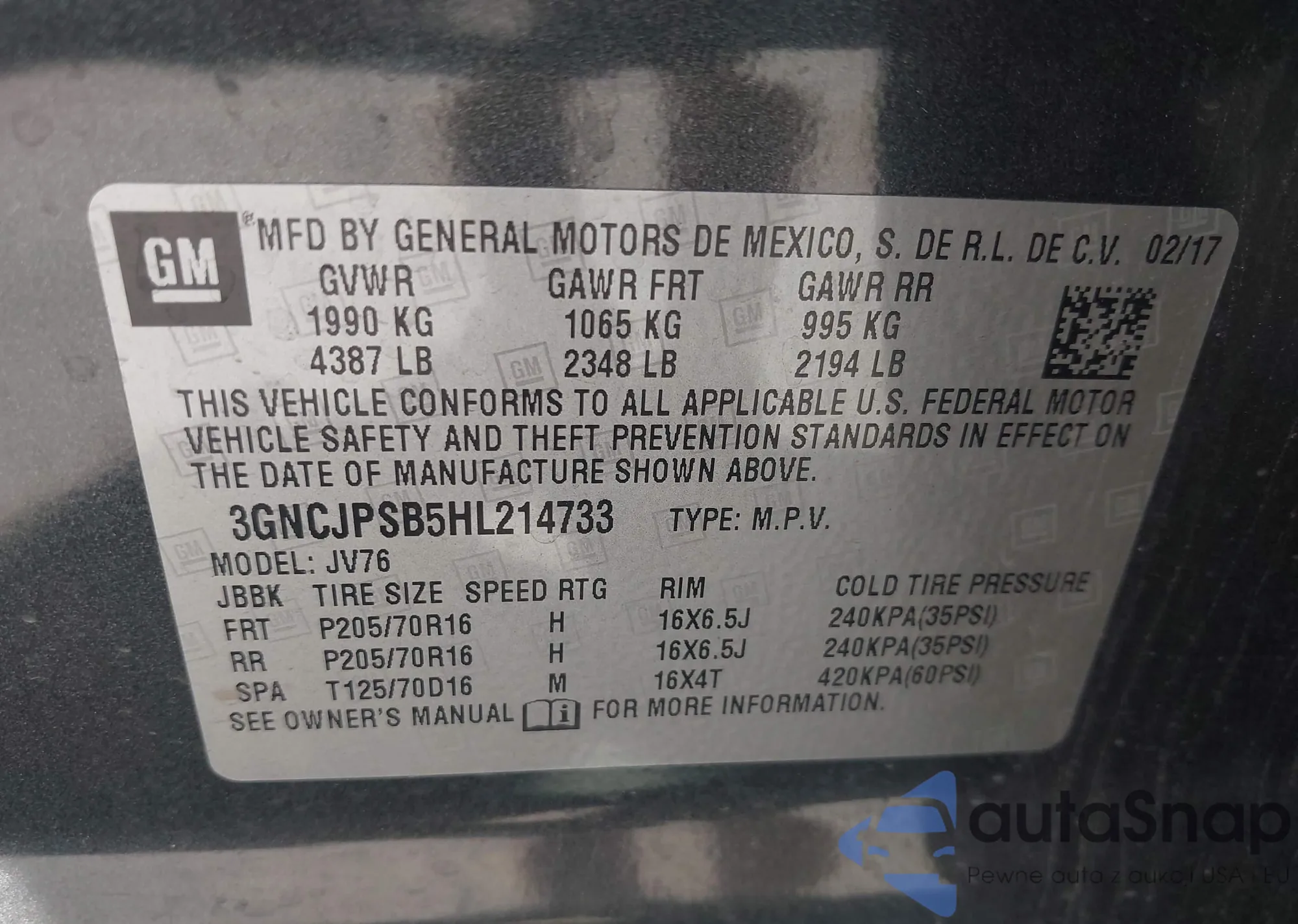 • VIN 3GNCJPSB5HL214733