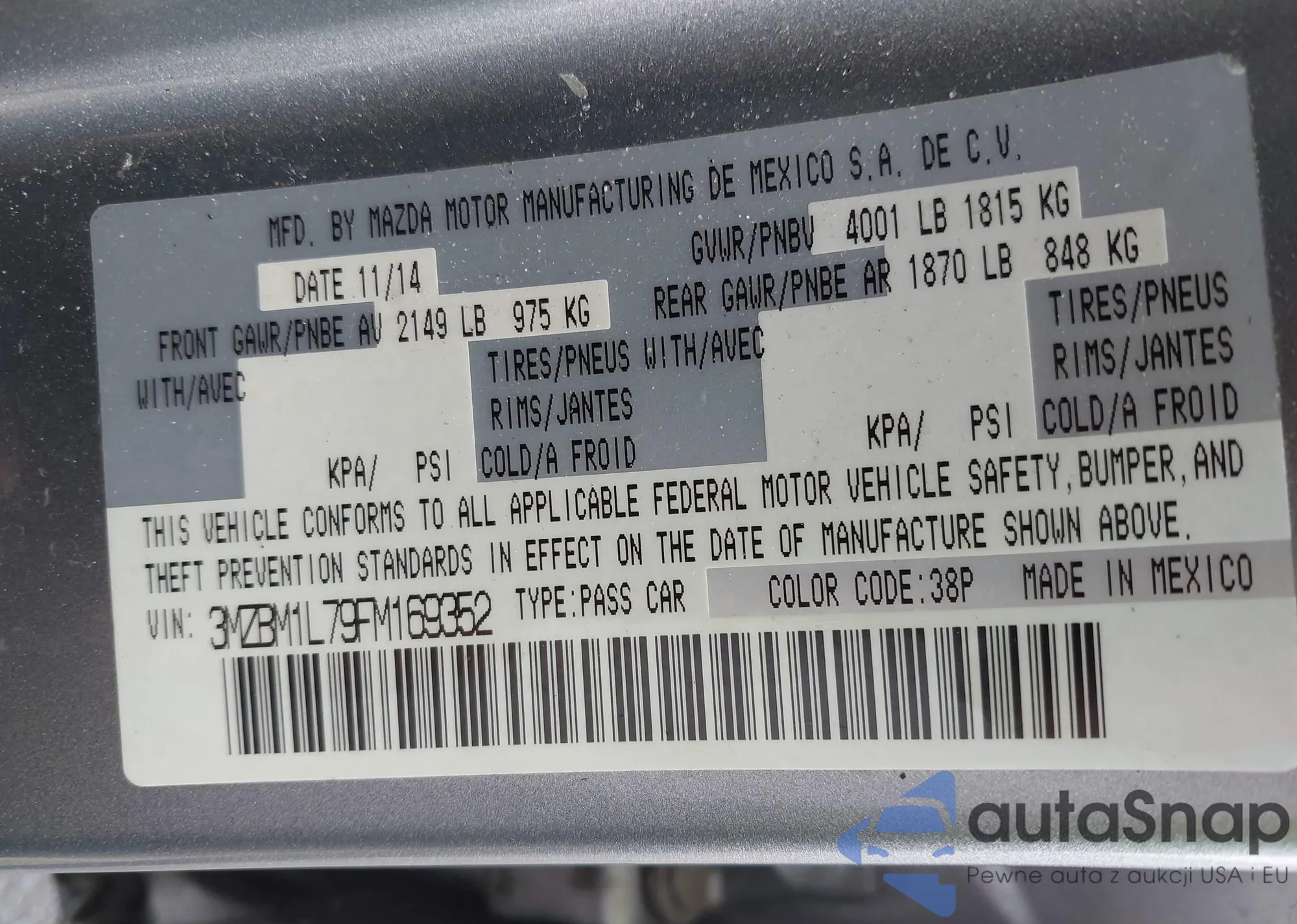 LOT: 39226548 VIN: 3MZBM1L79FM169352