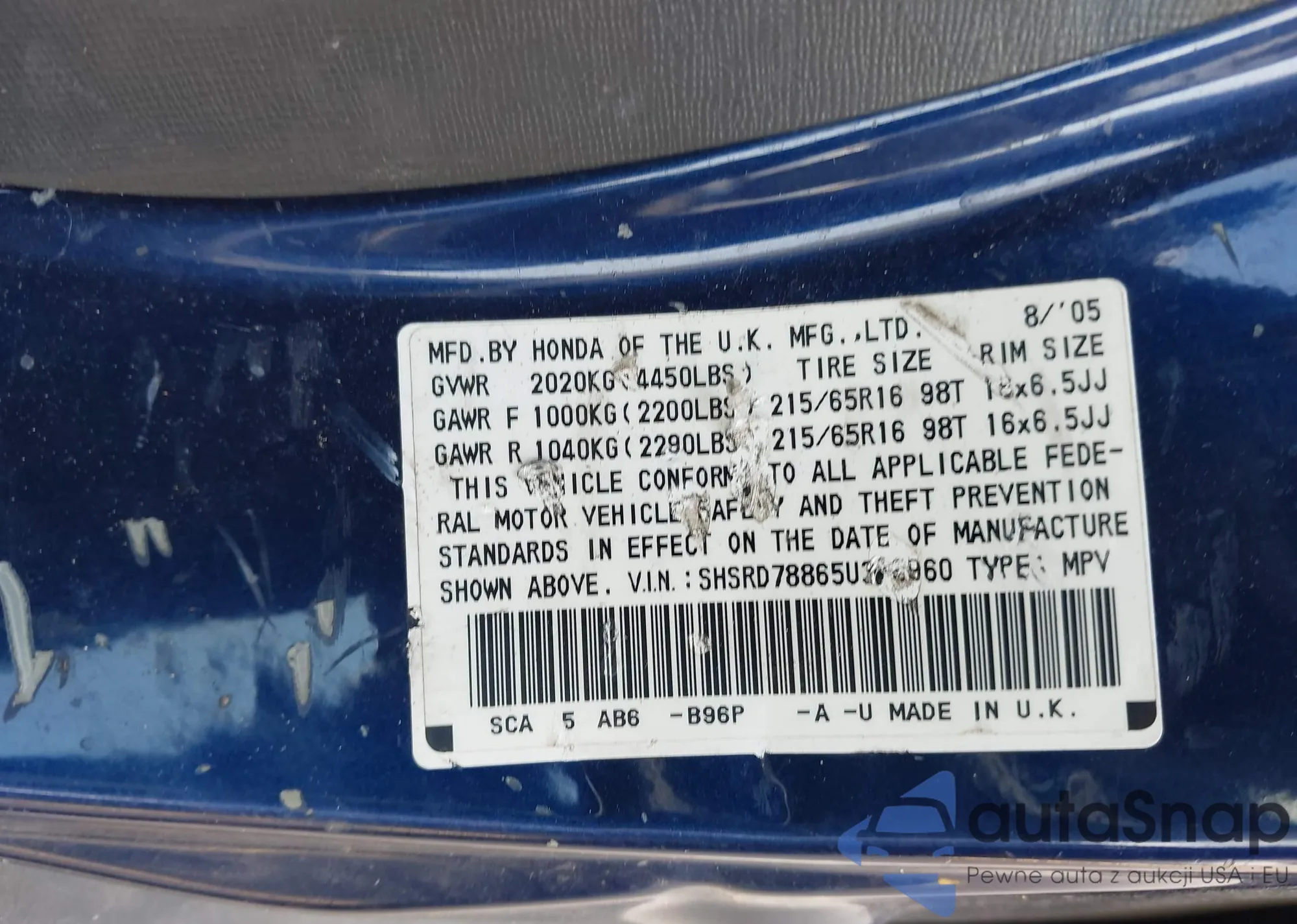 • VIN SHSRD78865U346960