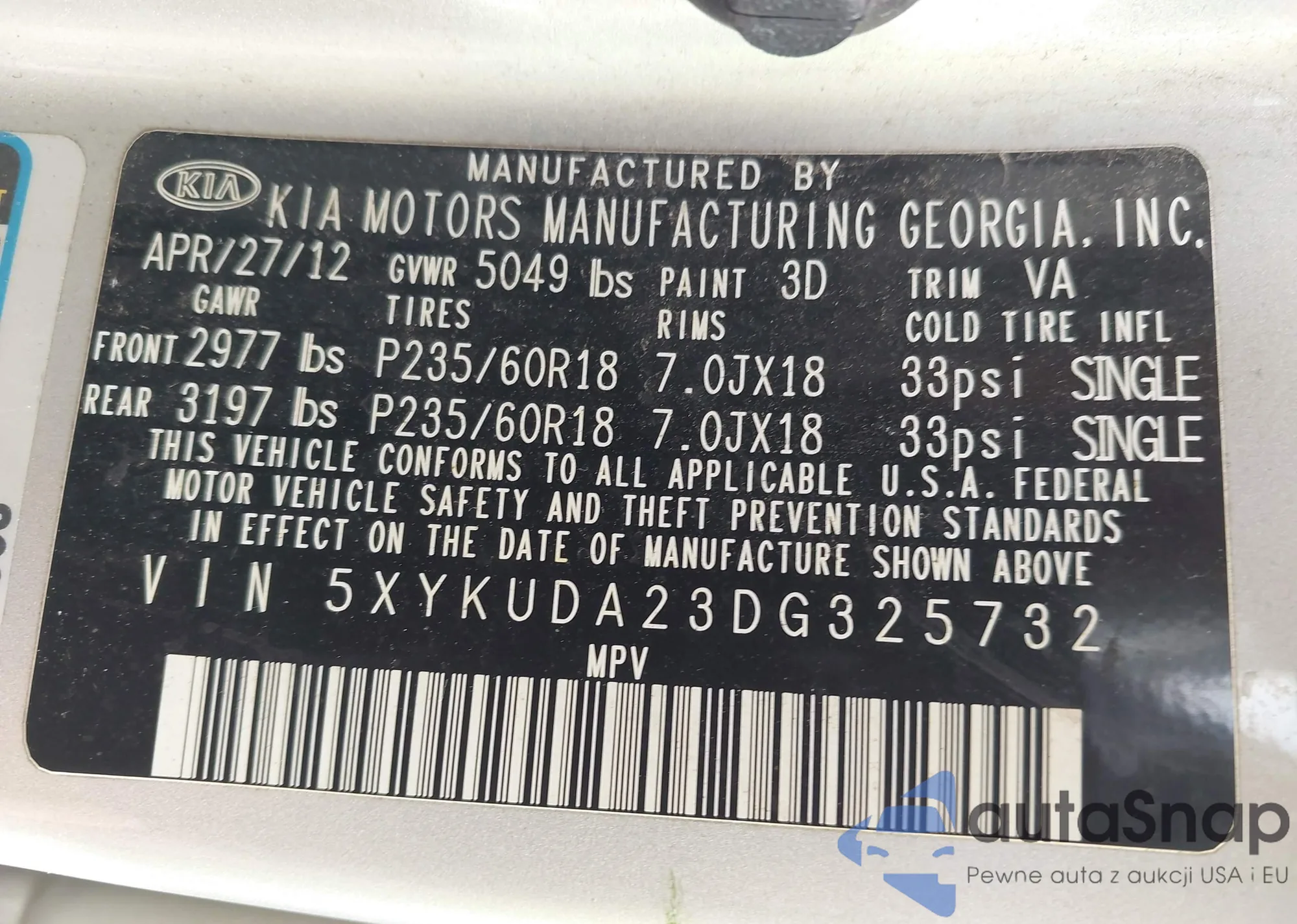 LOT: 42447268 VIN: 5XYKUDA23DG325732