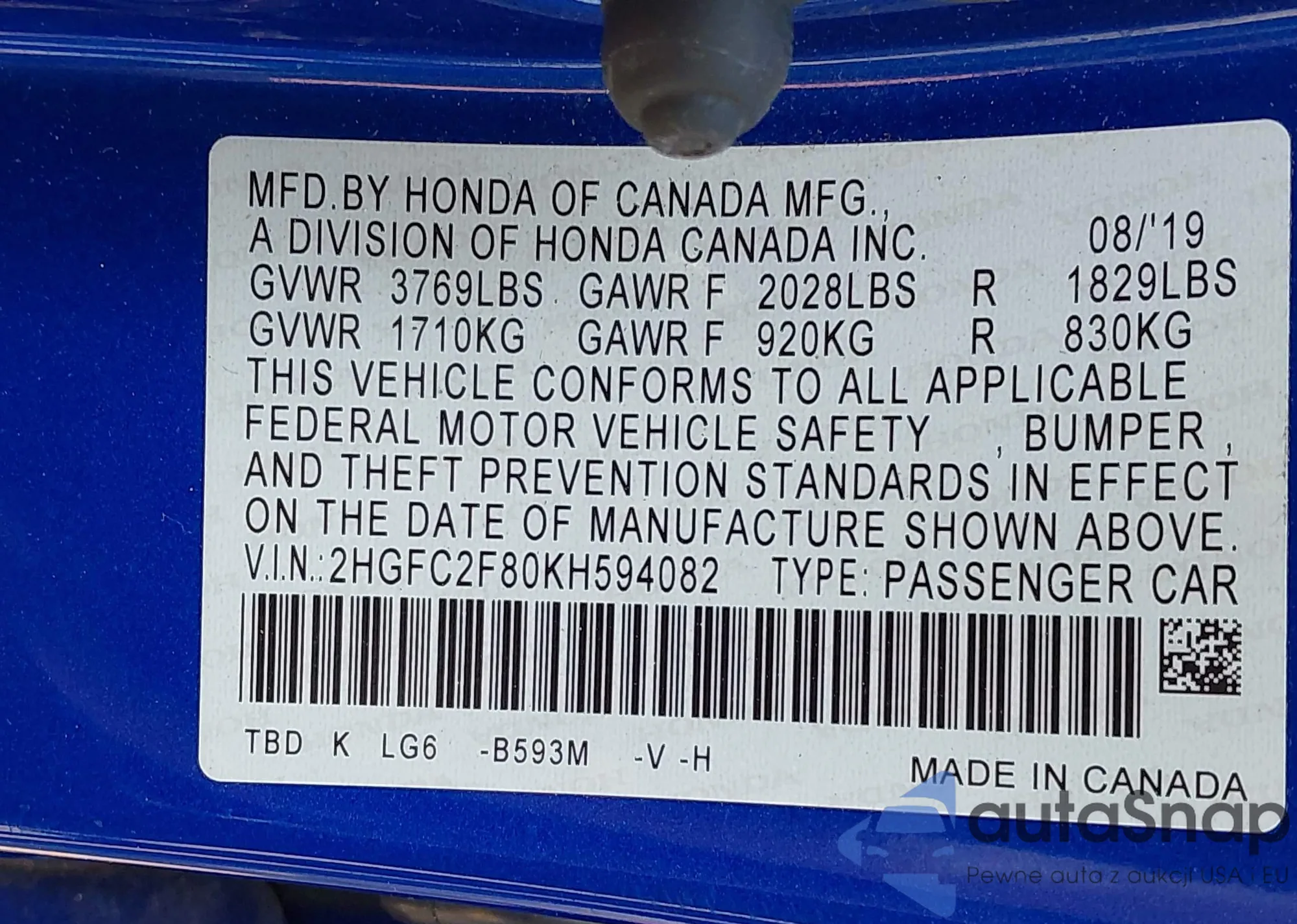 LOT: 42492057 VIN: 2HGFC2F80KH594082