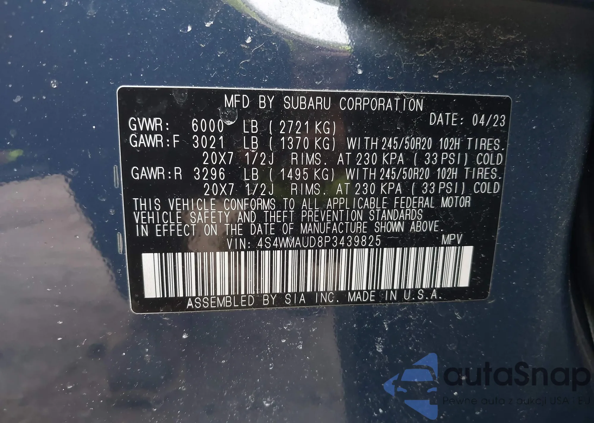 • VIN 4S4WMAUD8P3439825