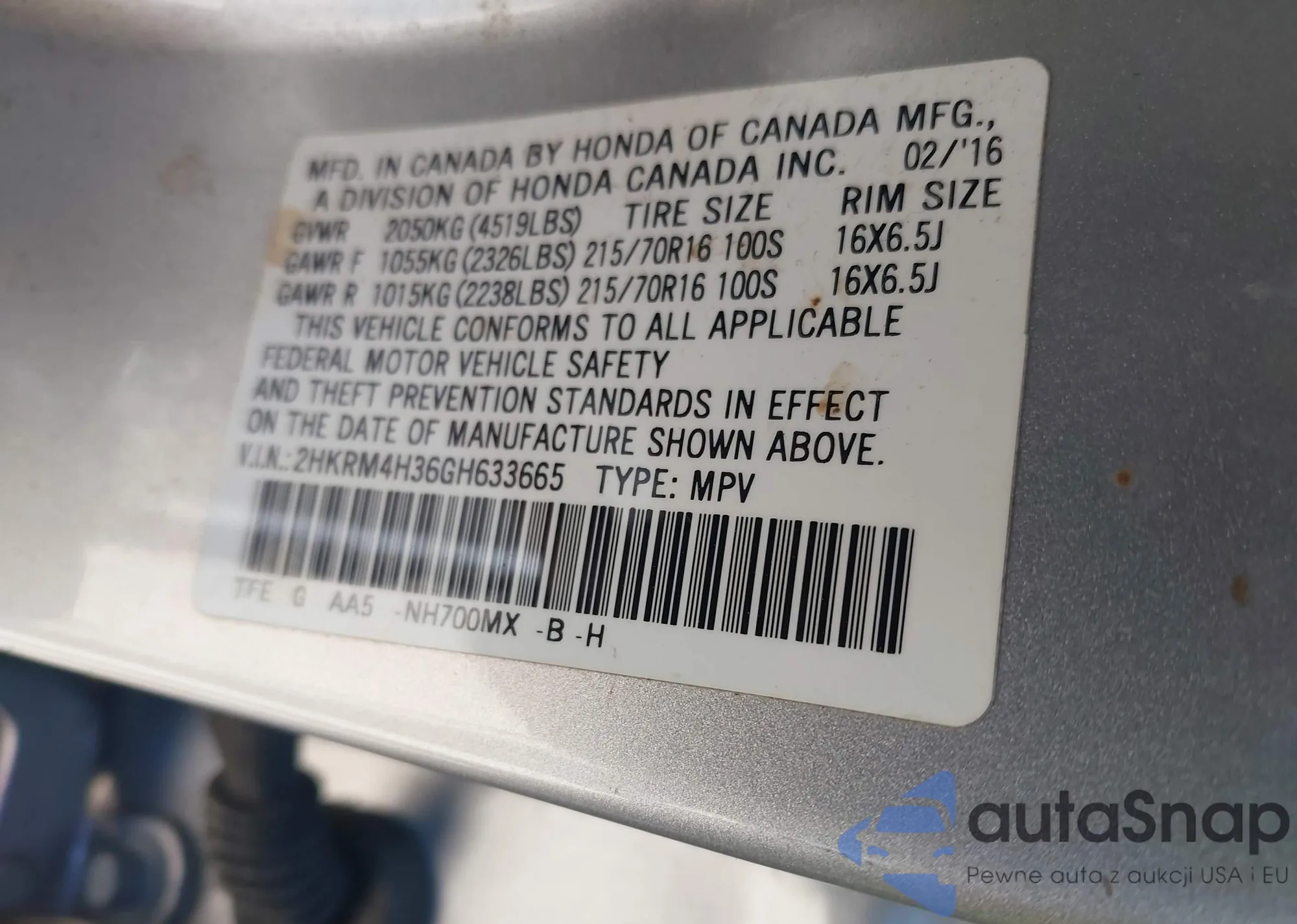 • VIN 2HKRM4H36GH633665