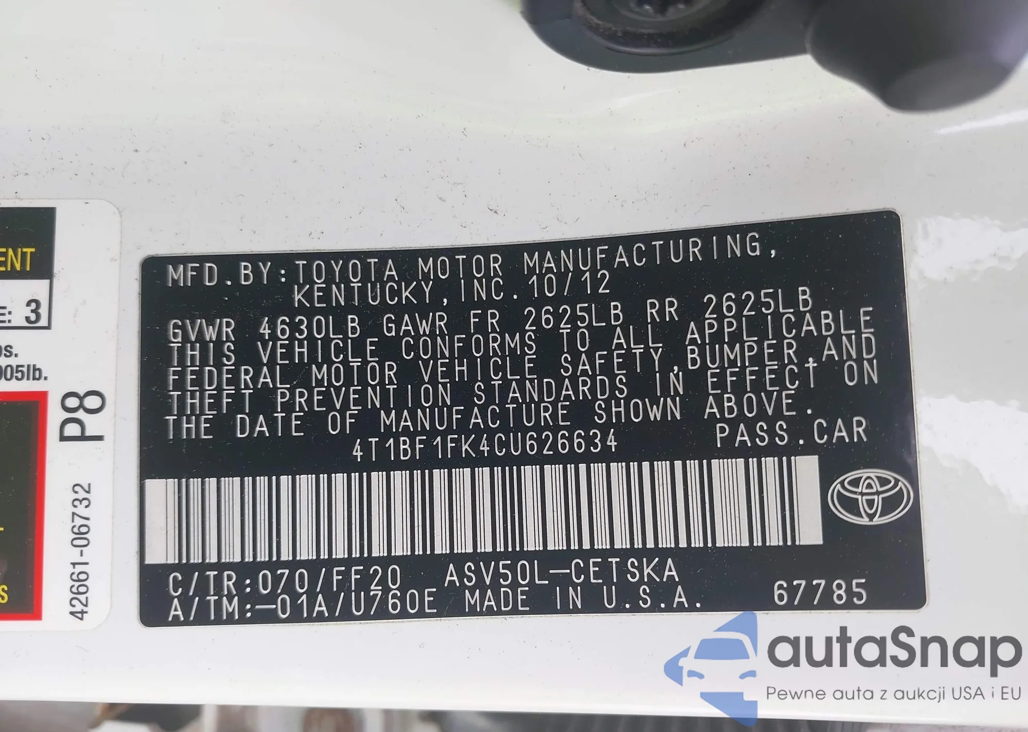 • VIN 4T1BF1FK4CU626634
