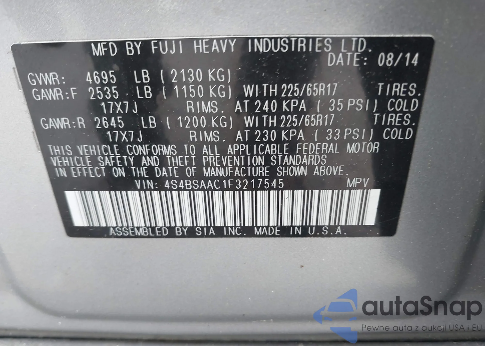 LOT: 42448345 VIN: 4S4BSAAC1F3217545